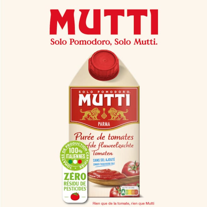 Mutti, entreprise familiale italienne spécialiste de la tomate en conserve, est née en 1899 près de Parme, au cœur de l’Emilie-Romagne, berceau de la gastronomie italienne. Depuis 120 ans, Mutti travaille en collaboration avec plus de 800 agriculteurs, pour offrir le meilleur de la tomate 100% italienne. Une union qui dévoile ses trésors, l’été, au moment de la récolte. Cultivées en plein champ sous le soleil d’Italie, les tomates sont transformées quelques heures après la récolte pour préserver toute leur fraîcheur et leur goût naturel.