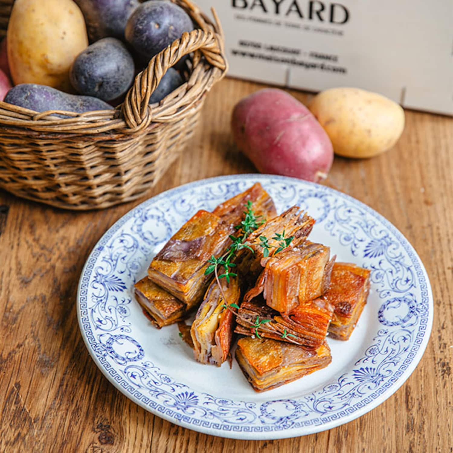 6 grosses pommes de terre Bayard (Aztec Gold, Lily Rose, Prunelle)|90 g de beurre|2 cuillères à soupe de fécule de maïs|Sel & poivre