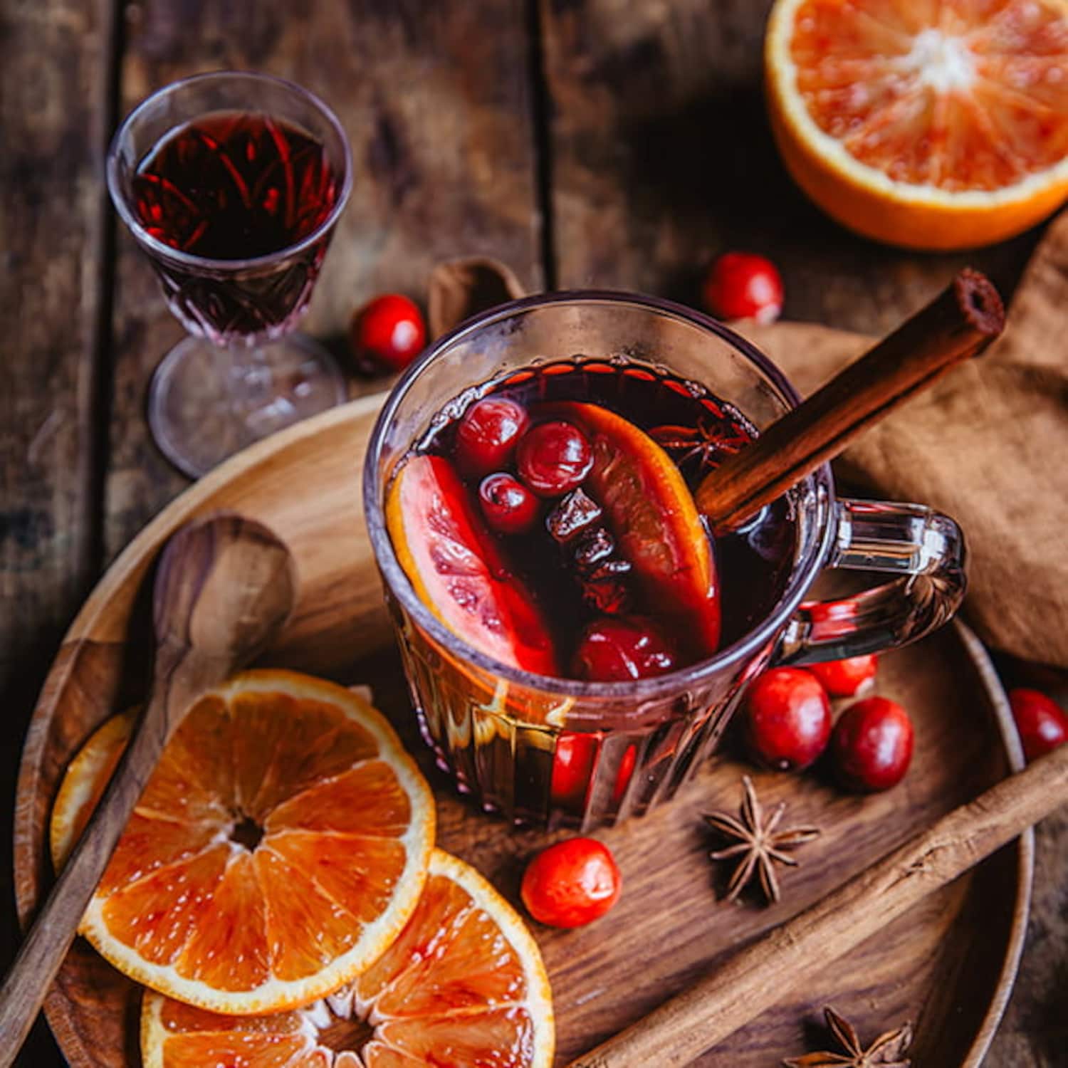 200 ml de vin désalcoolisé|20 g de sucre|2 étoiles de badiane|1 bâton de cannelle|2 clous de girofle|4 cranberries fraîches|3 tranches d’orange|2 tranches de citron