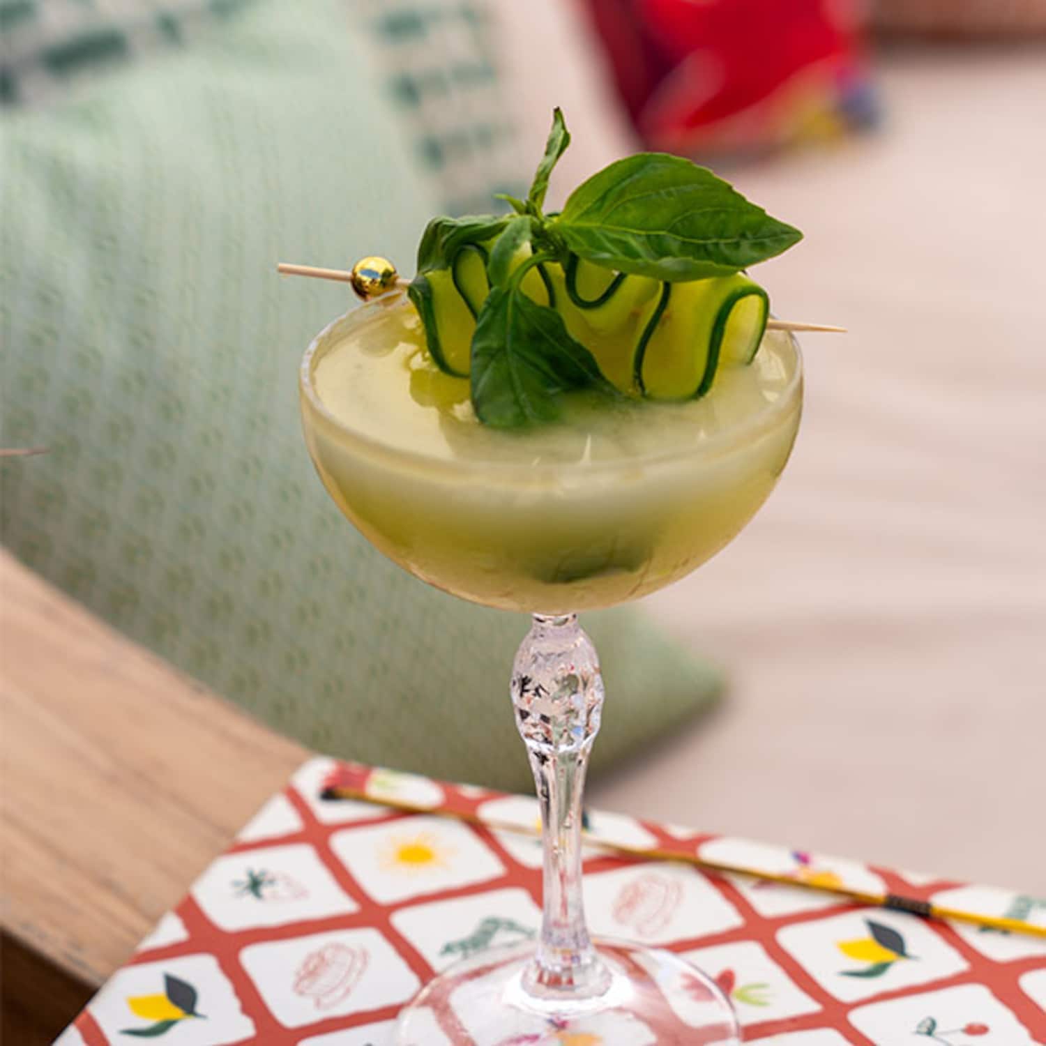 3 cl de purée de concombre|2 cl de sirop de gingembre|2 cl de jus de citron vert fraîchement pressé|1,5 cl d’huile d’olive Kalios x Lucia|1 poignée de feuilles de basilic frais|3 à 4 gouttes de Fee Foam|3 cl d’eau fraîche