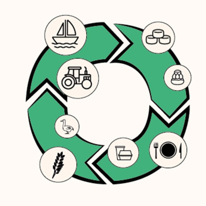 - Le 100% producteurs identifiés : un approvisionnement riche de sens, qui soutient les agriculteurs, éleveurs, pêcheurs, fromagers à taille humaine, PME, coopératives, soit des entreprises familiales avec un savoir-faire artisanal.