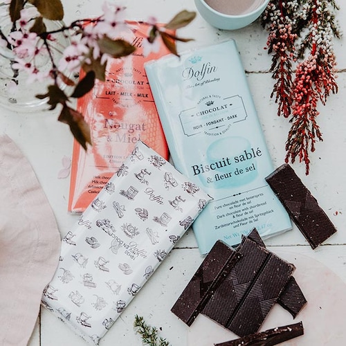 Ludiques, les mini-tablettes de Dolfin concilient classiques noir ou lait et mariages inédits, lavande, spéculoos, crumble à la banane. Création de François Pralus, la barre infernale se décline en lait praliné ou brut de plantation, aux notes épicées acidulées.