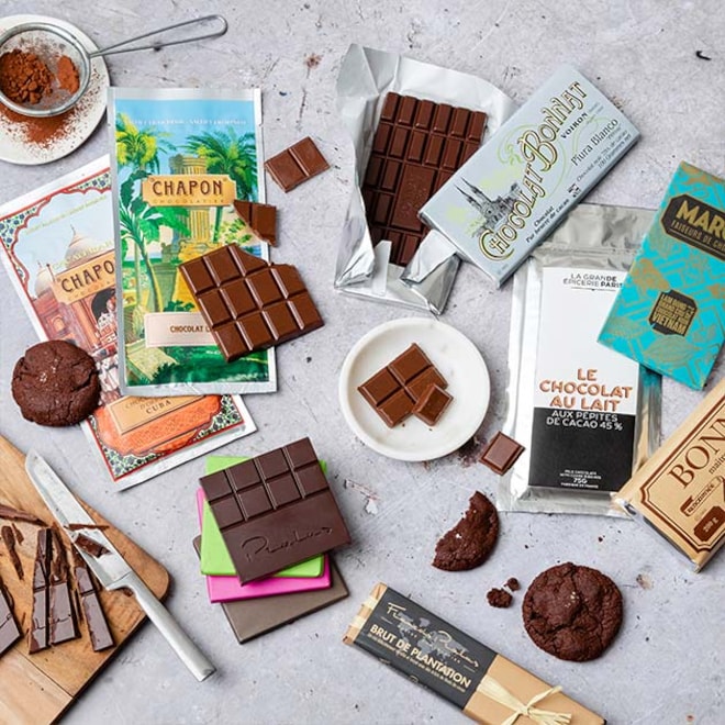Composés de 32 ou 52 carrés de chocolats, les coffrets de dégustation Valrhona font voyager à travers les grands crus, comme l’Abinao 85% cacao, ou le Manjari malgache, au profil acide et fruité. Présentés dans d’élégants écrins, les assortiments de bonbons de chocolat La Grande Épicerie de Paris proposent ganaches et pralinés au chocolat noir, lait et blanc.