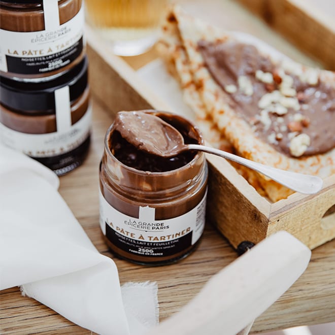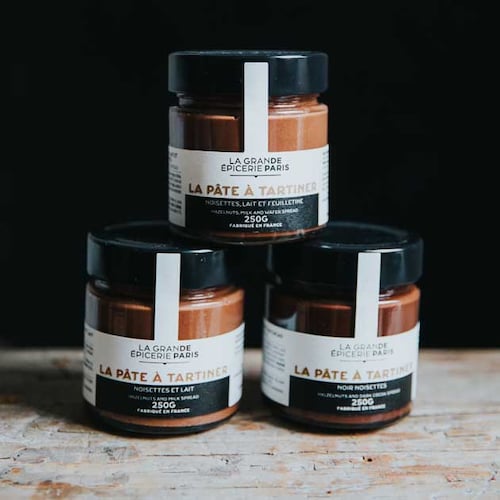 Tout aussi gourmande, la collection de pâtes à tartiner La Grande Épicerie de Paris se décline aux noisettes et cacao noir ou lait ou encore ponctuée de quelques brisures de crêpes dentelles. Sa gamme caramel au beurre salé est aromatisée au cacao, à l’orange ou à la vanille, à déguster au petit déjeuner sur du pain frais ou en dessert, sur des crêpes.