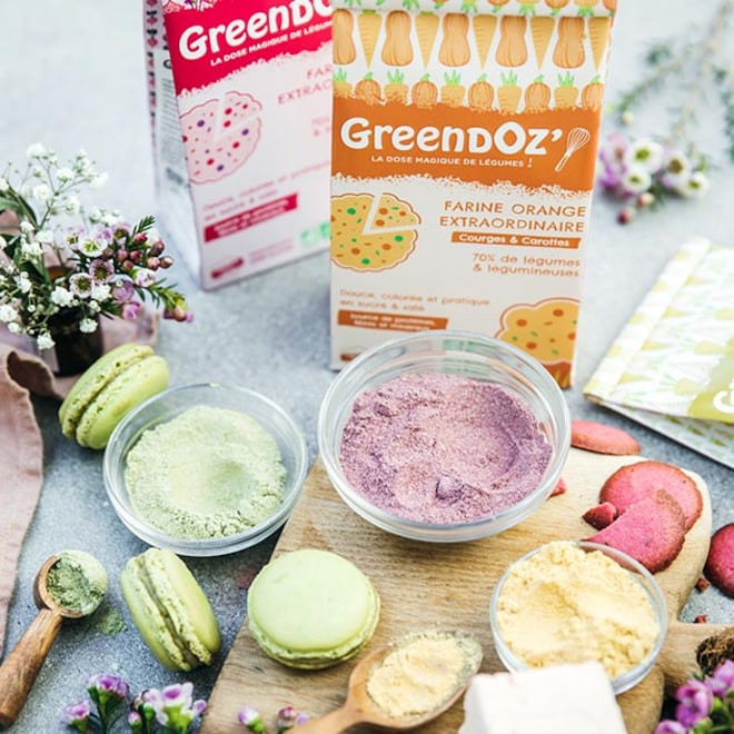 Créé par deux spécialistes de la nutrition, GreendOz propose des farines hautes en couleur, permettant de consommer les légumes autrement. La farine rose est par exemple réalisée à partir de légumes et légumineuses, dont 44% de betteraves, et la farine orange avec des courges et des carottes.