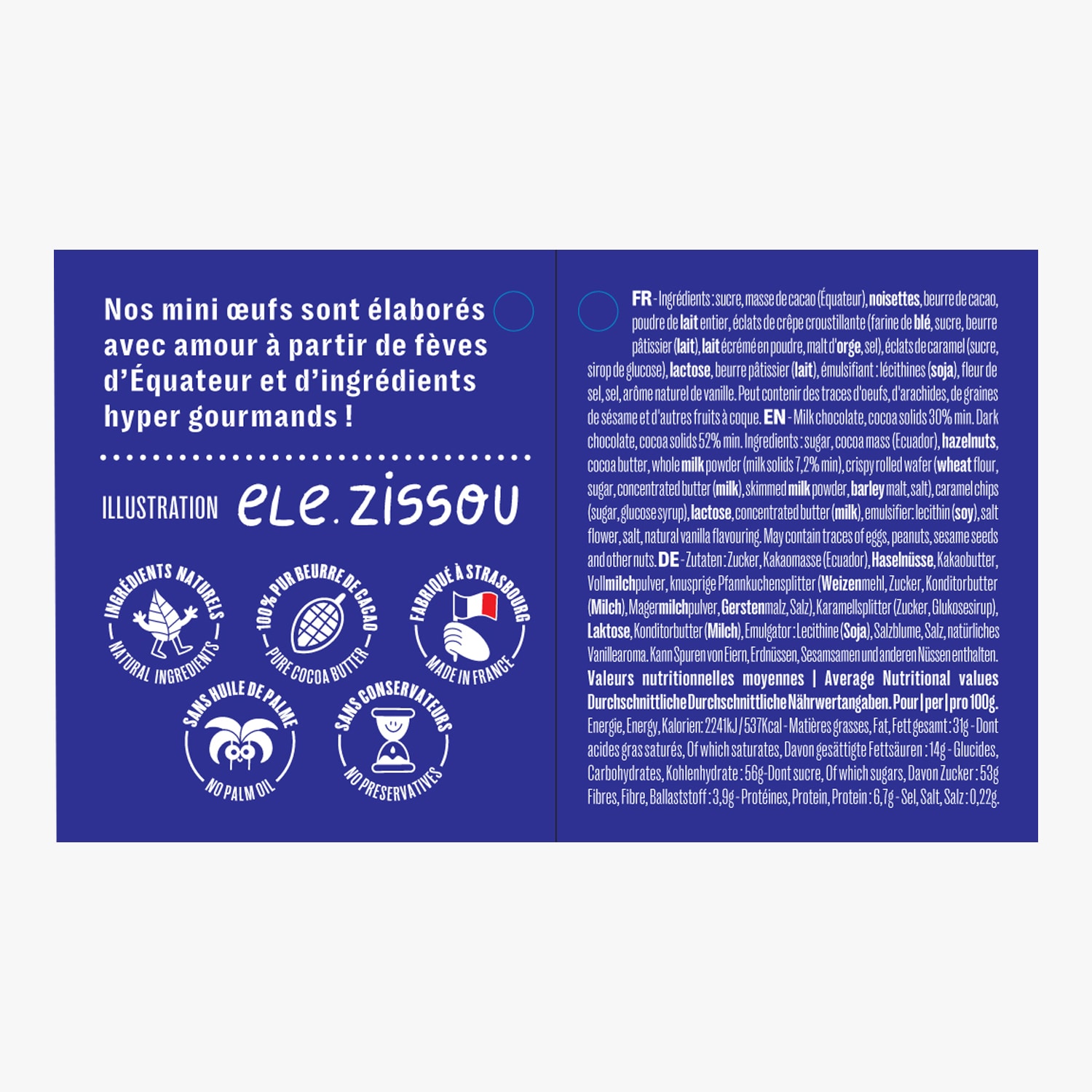 Œufs pralinés noisettes, œufs gianduja feuilleté, chocolat noir et lait