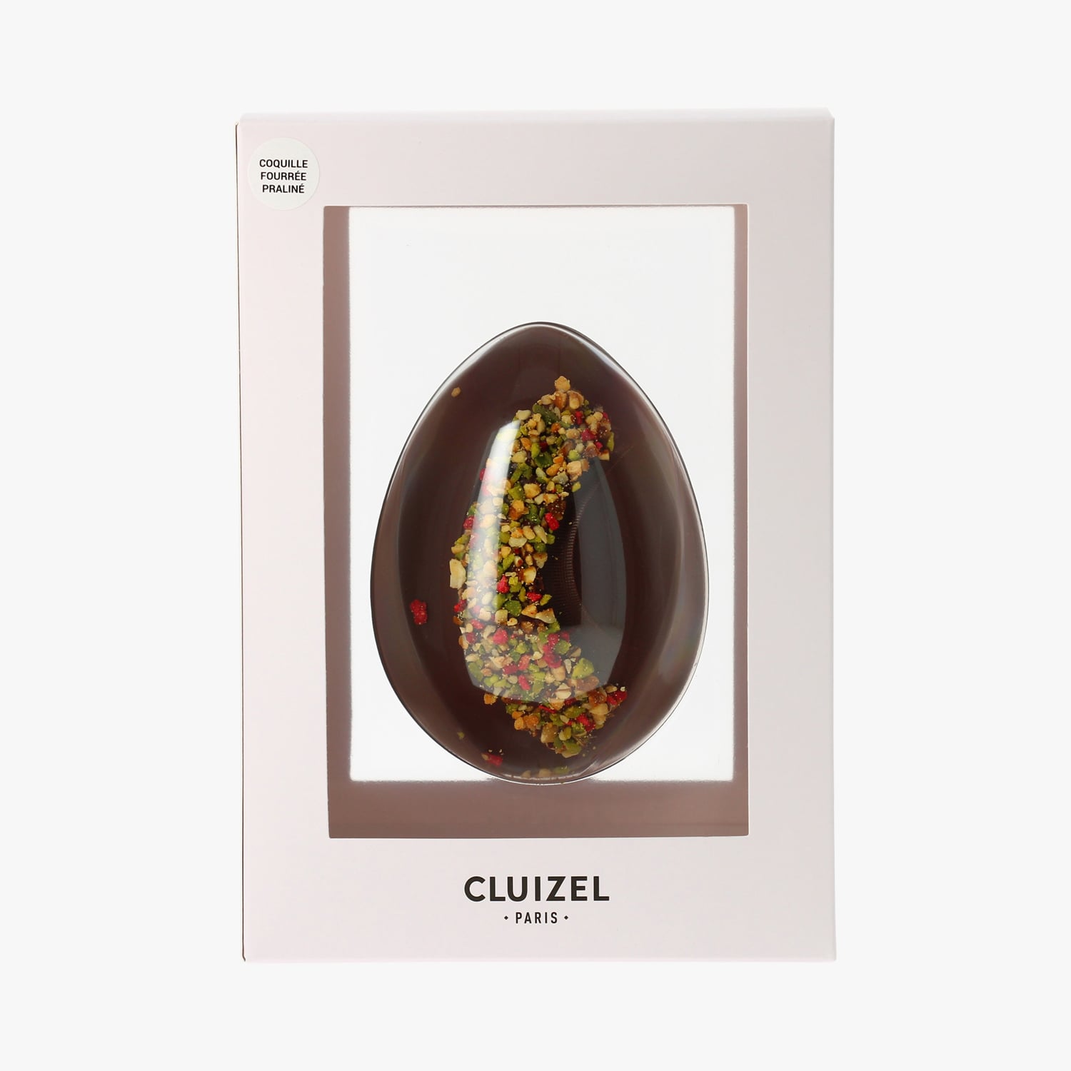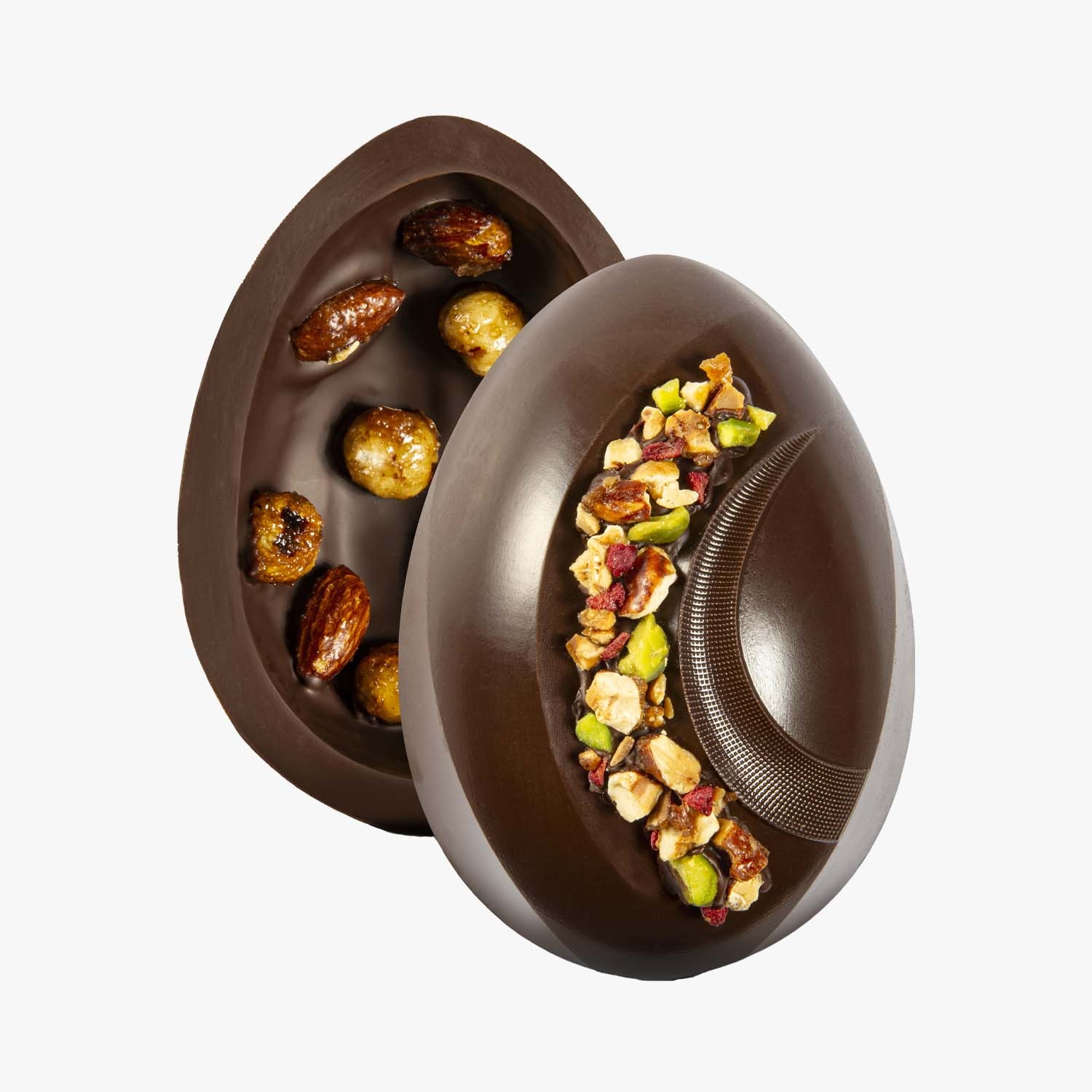 Chocolat noir de Madagascar (66% de cacao min.) garni de praliné, décor fruits