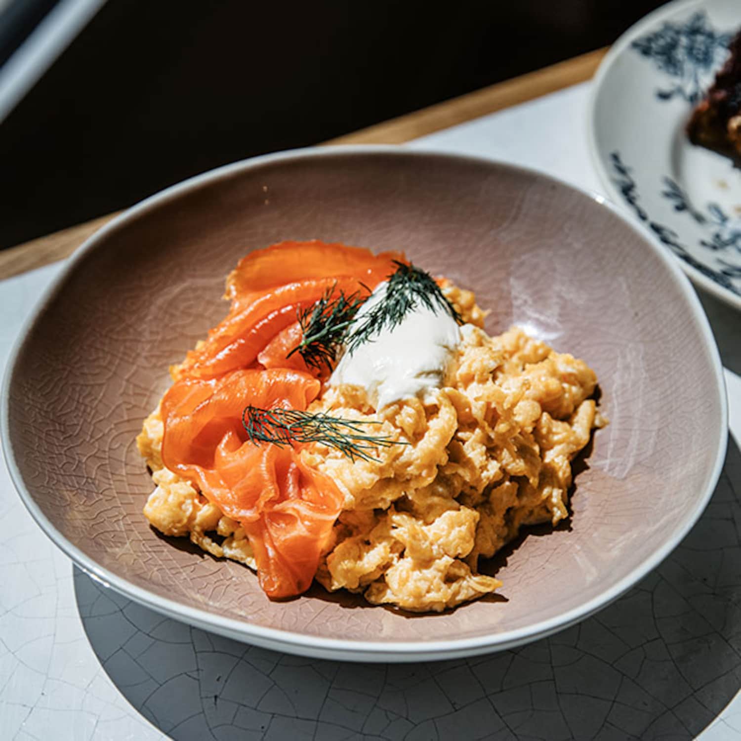 4Versez la brouillade au fond d’un bol, puis ajoutez le saumon fumé, surmonté d’une quenelle de crème et d’aneth. Dégustez avec des biscuits shortbread.