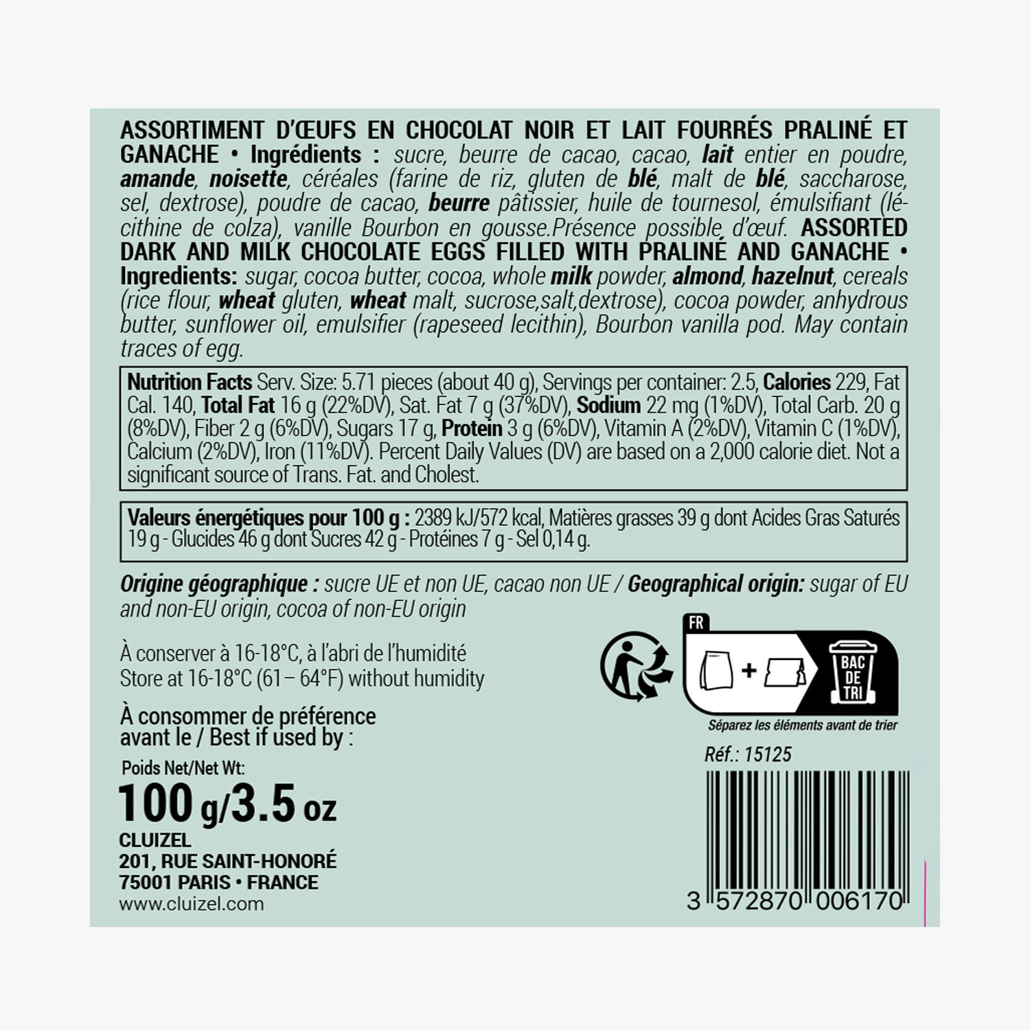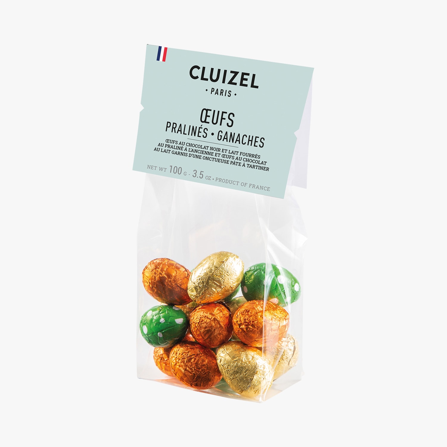 Assortiment d'œufs en chocolat noir et lait fourrés praliné et ganache, sous alu