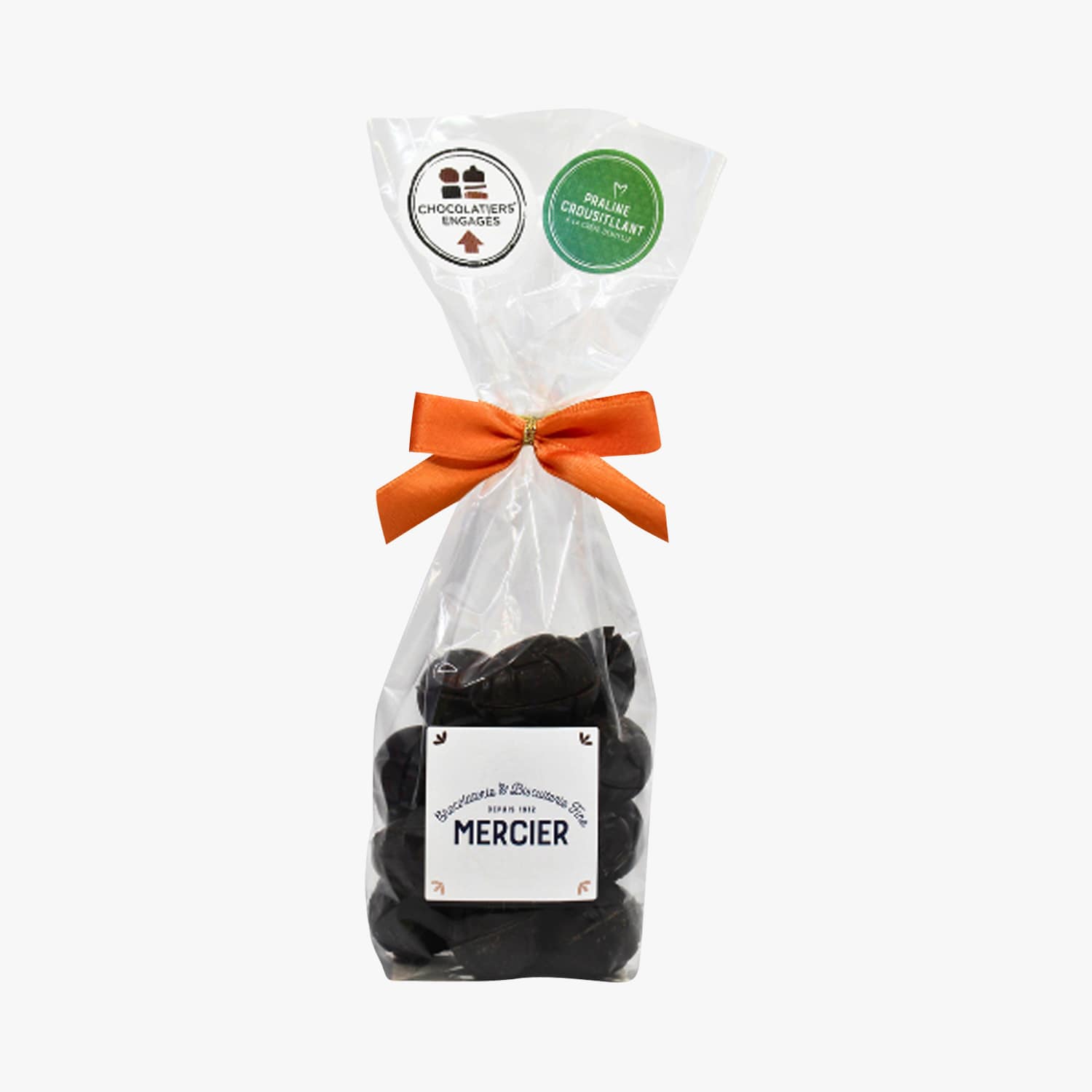 Bonbons enrobés de chocolat noir fourrés de praliné feuilleté
