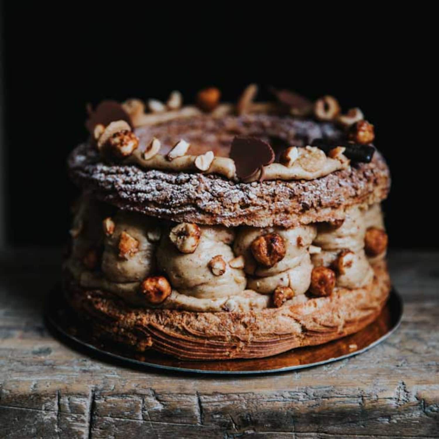 Versez la crème refroidie à température ambiante dans le bol d'un robot pâtissier, puis fouettez le beurre pommade. Ajoutez le praliné et la pâte de noisettes, puis incorporez progressivement la crème pâtissière. Laissez monter.<br>