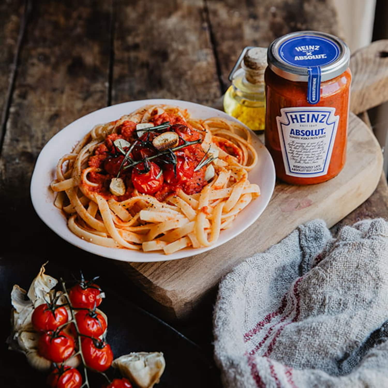 500g de pâtes tagliatelle La Grande Epicerie de Paris | 1 pot de sauce tomate Heinz Absolut | 1 grappe de tomates cerises en branche | 1 gousse d'ail | 1 branche de romarin | Huile d'olive