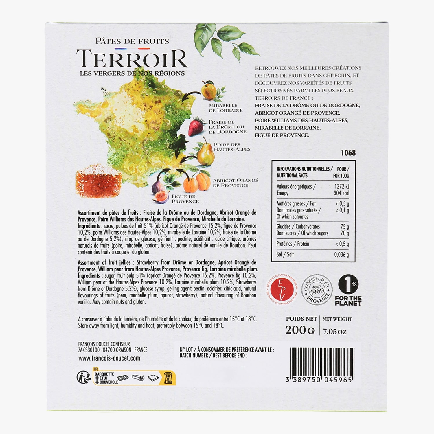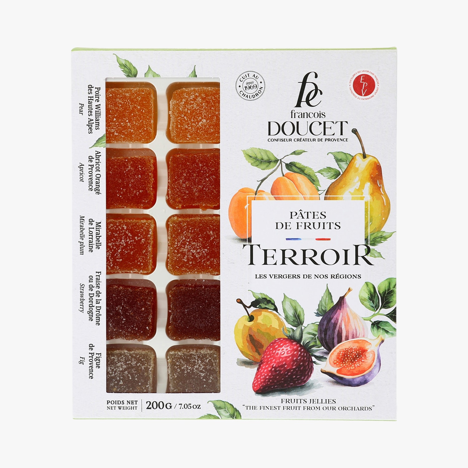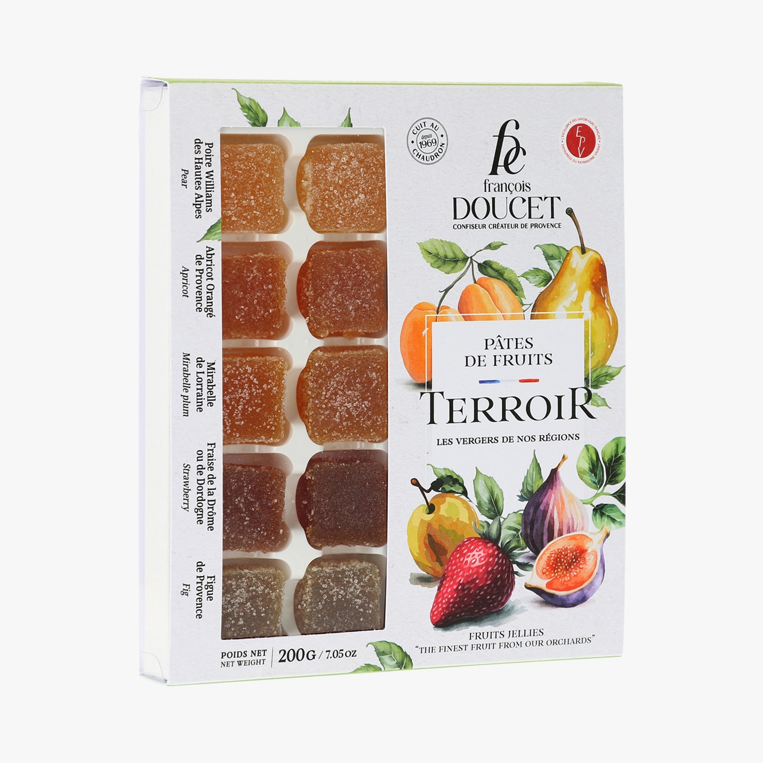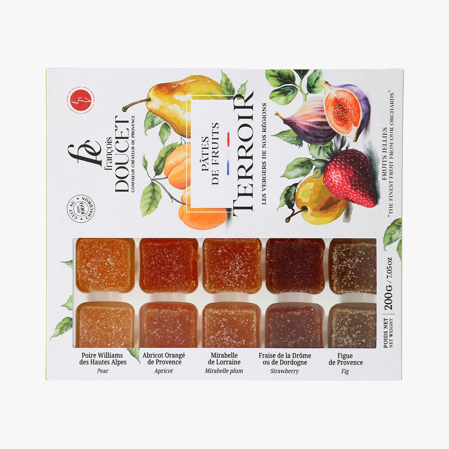 Assortiment de pâtes de fruits : fraise de la Drôme ou Dordogne, abricot orangé de Provence, poire Williams des Hautes-Alpes, mirabelle de Lorraine, figue de Provence