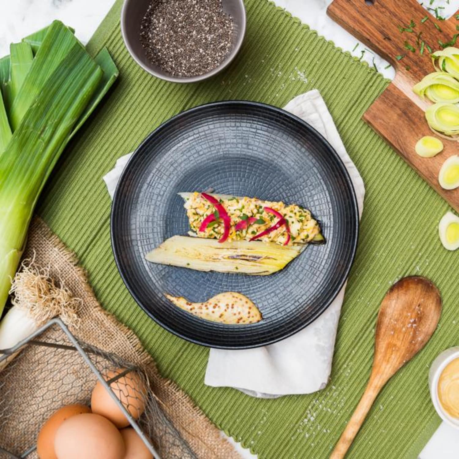 2 poireaux | 3 œufs | 1 botte de ciboulette | 1 cuillère à soupe de moutarde à l’ancienne | vinaigre | sel | poivre | 150 ml d’huile neutre (de tournesol ou de pépin de raisin) | 1 oignon rouge | 1 citron jaune