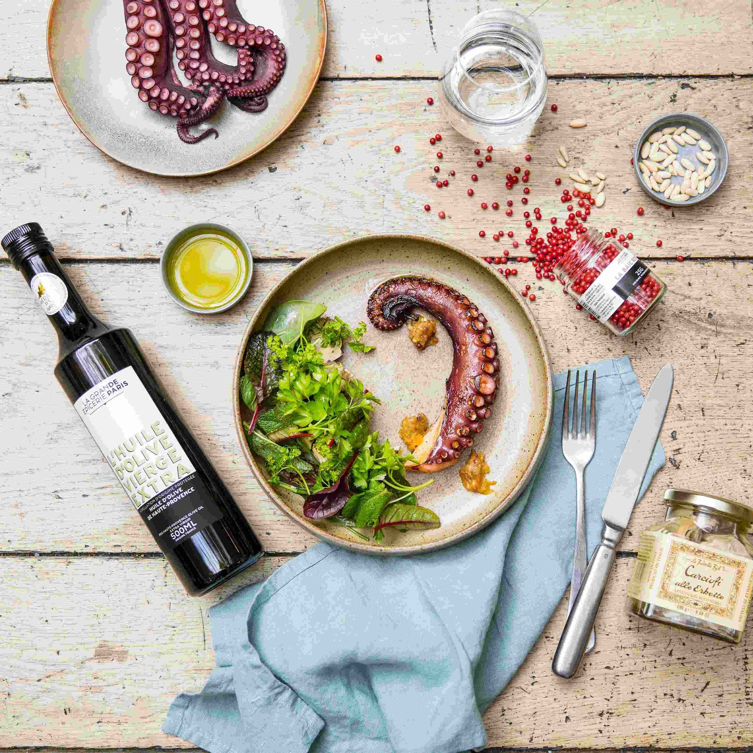 <span class="content">Sortez le poulpe du four, coupez les tentacules ou détaillez-les en plus petits morceaux selon votre goût. Faites-les revenir dans une poêle bien chaude avec un peu d'huile d'olive durant une minute afin que les tentacules soient légèrement croustillantes. Servez aussitôt dans une assiette en séparant le poulpe de la salade.</span>
