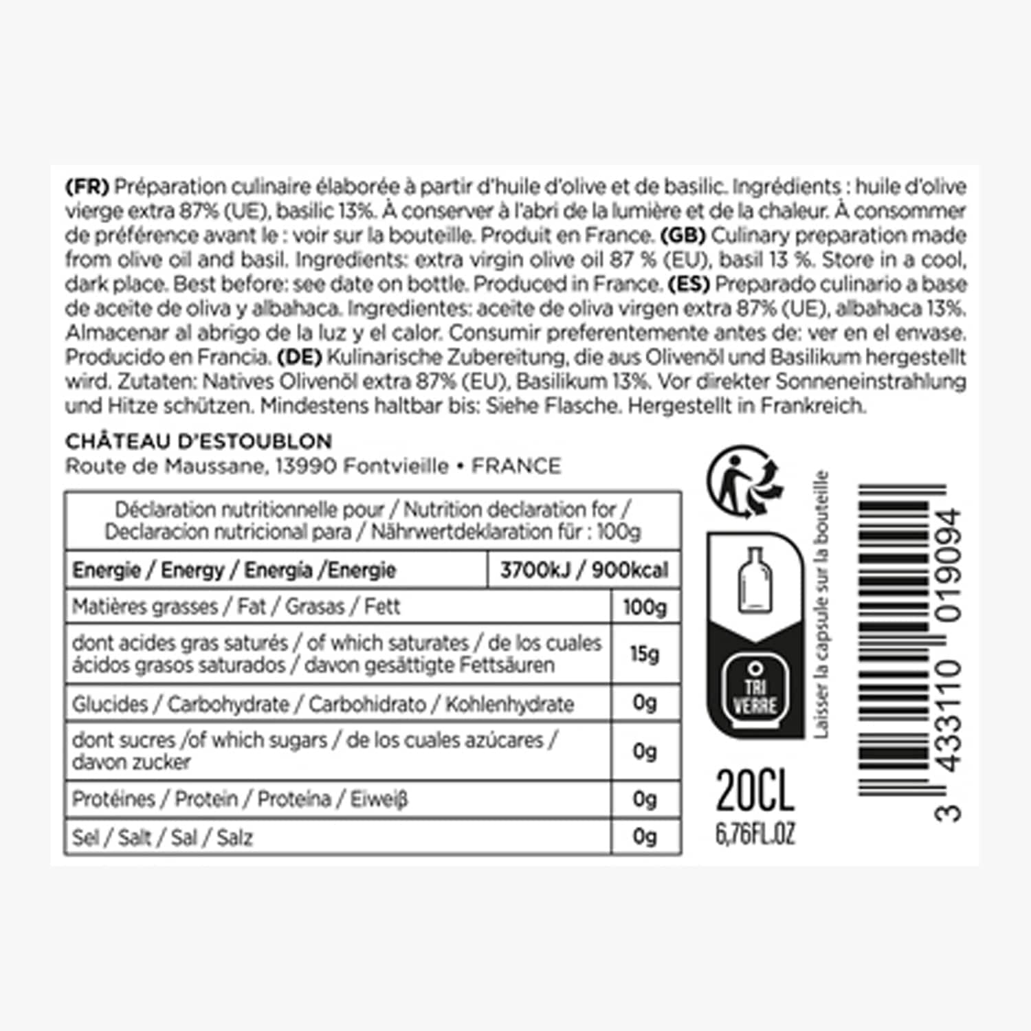 Préparation culinaire à base d'huile d'olive et de basilic Château d'Estoublon