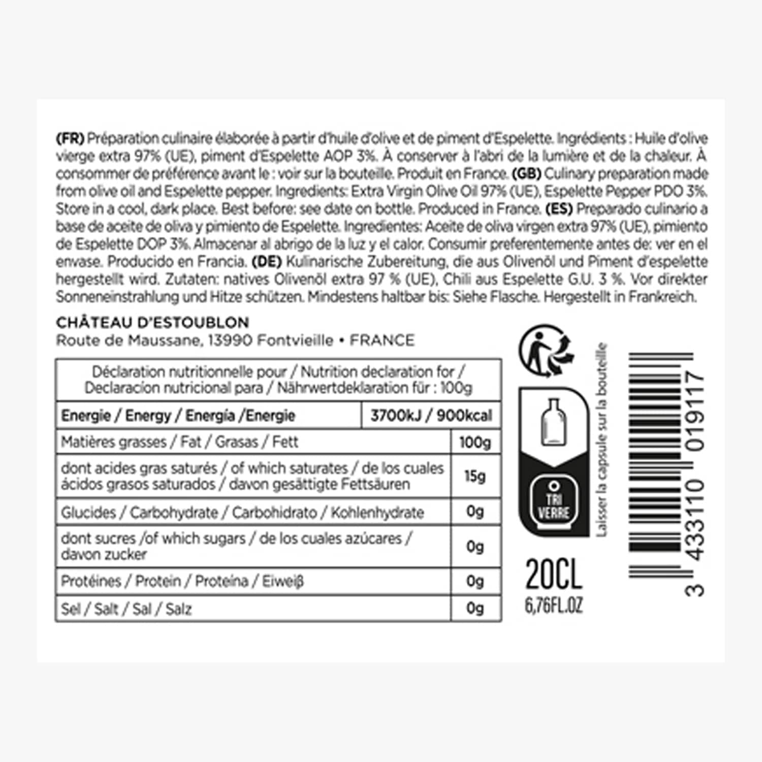 Préparation culinaire à base d'huile d'olive et de piment d'Espelette Château d'Estoublon
