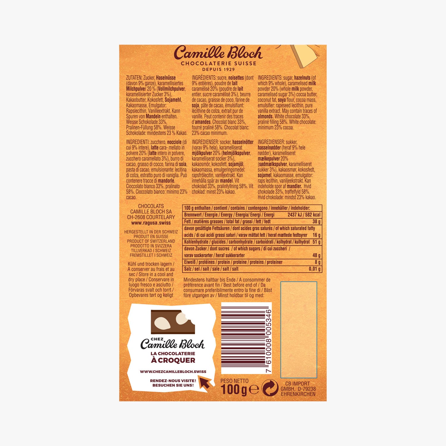 Confiserie au chocolat blanc au lait en poudre caramélisé fourré praliné et noisettes entières
