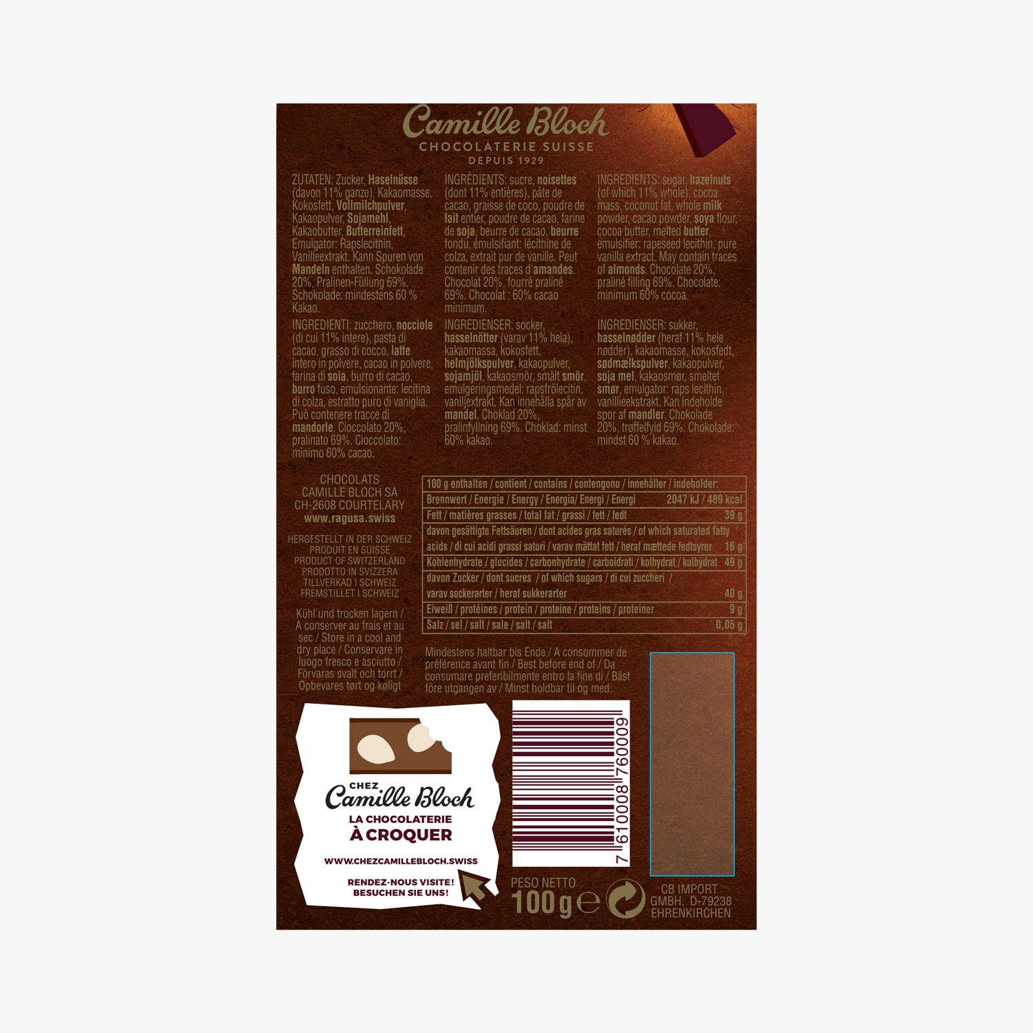 Confiserie au chocolat noir fourré praliné et noisettes entières