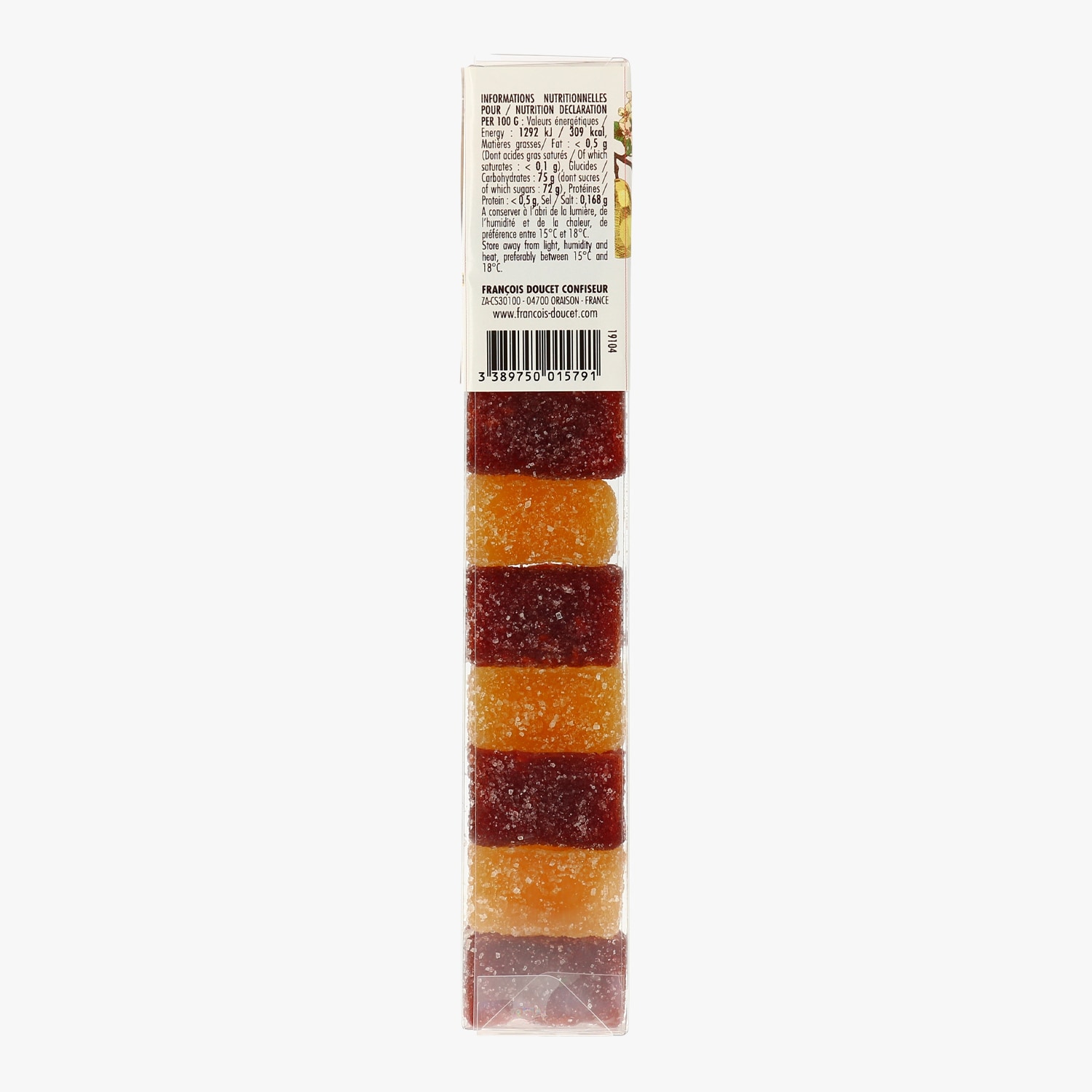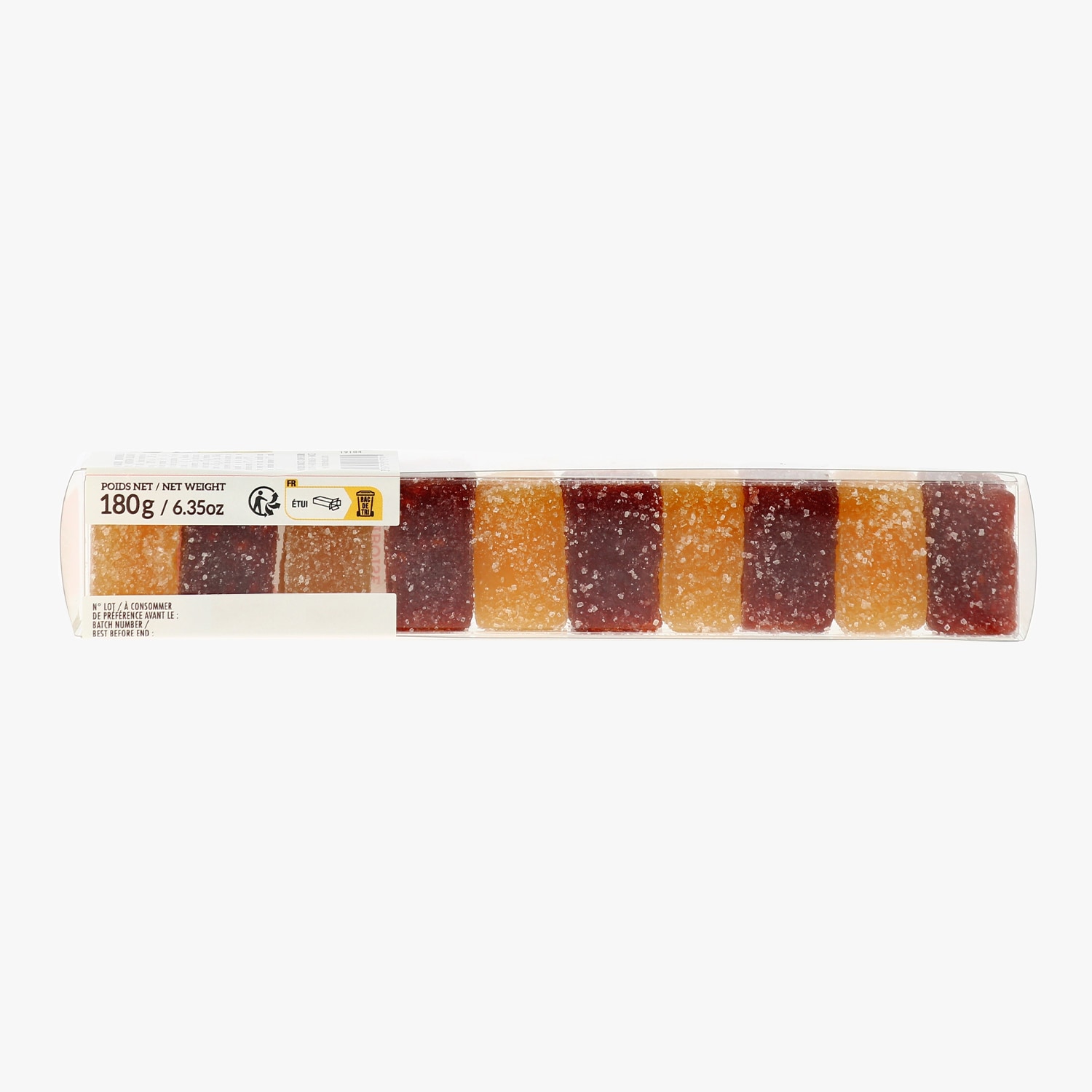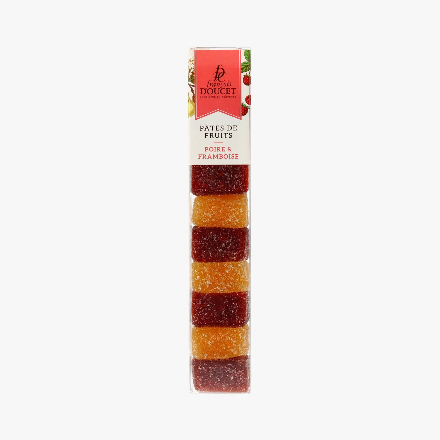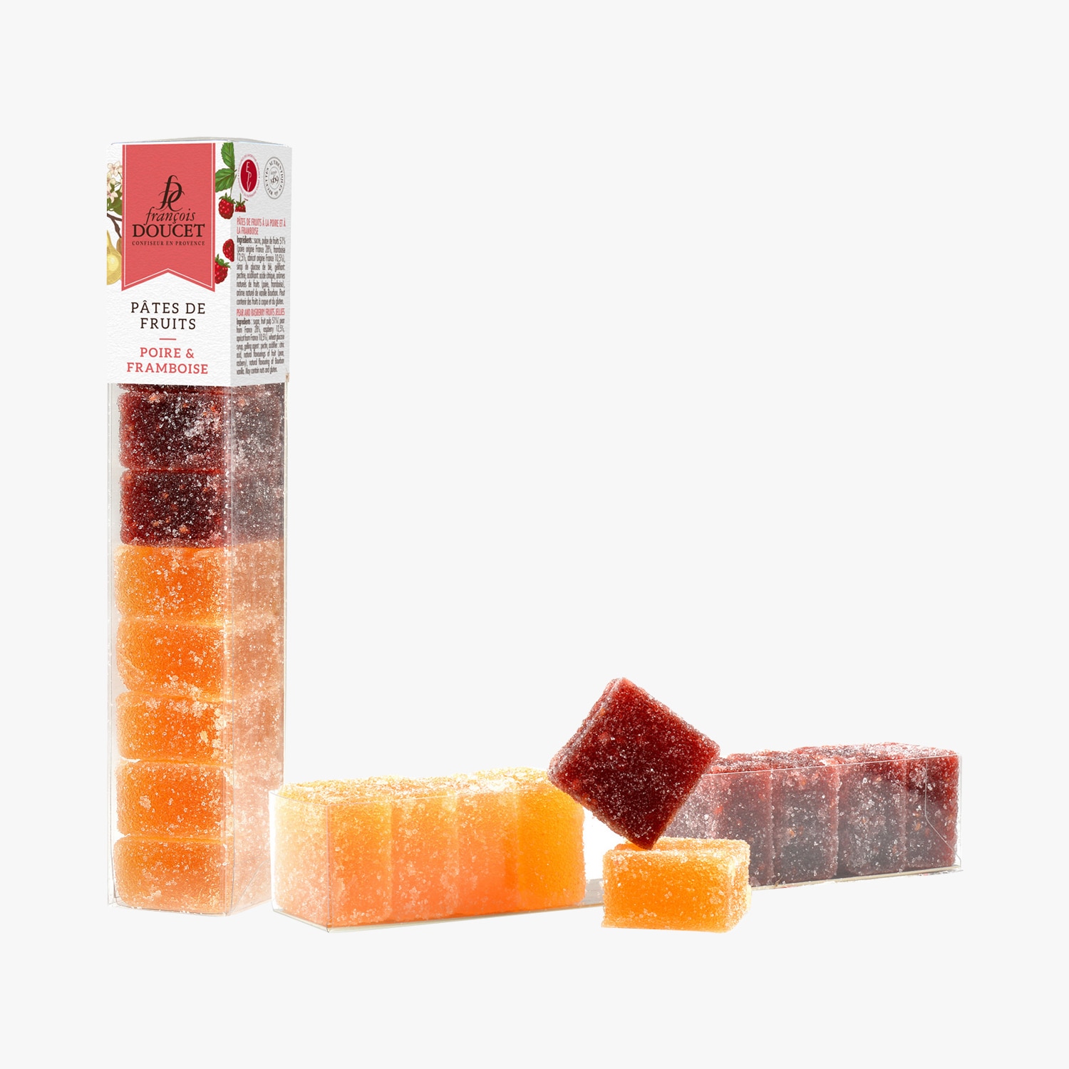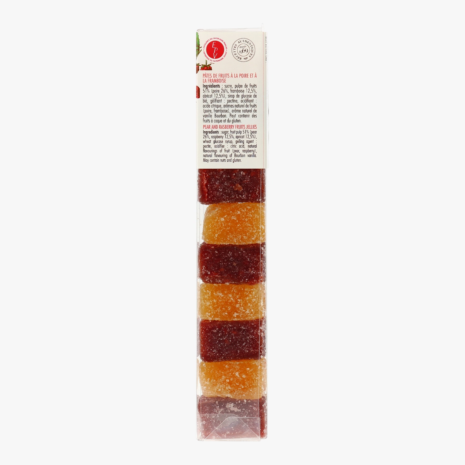 Reglettes de pâtes de fruits à la poire williams des Hautes Alpes et à la framboise, présentées sous forme de carrés.