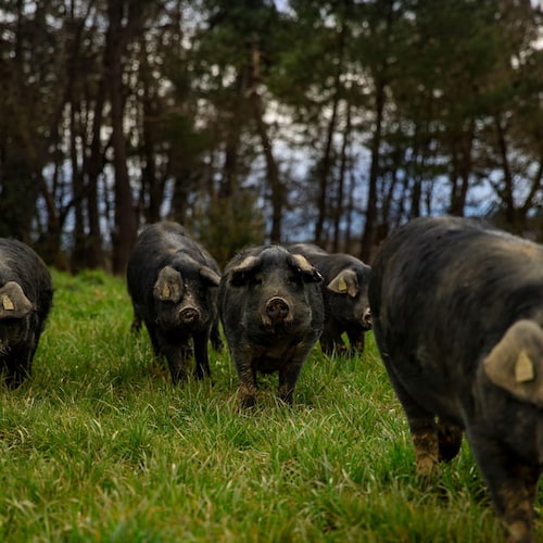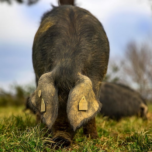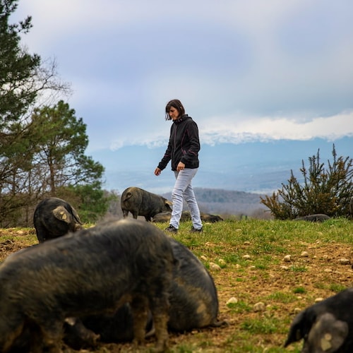 Emilie : l’alimentation est l’un des piliers de l’élevage des Porcs Noirs de Bigorre : elle doit être composée de 70% de céréales au minimum. En ce qui concerne les 30% restants, il s’agit principalement des éléments que les porcs trouvent dans la nature : herbe, glands, châtaignes ou fruits par exemple. Un autre prérequis important pour l’AOP concerne l’espace : un maximum de 20 porcs par hectare est autorisé, et la surface doit impérativement être composée de 70% d’herbe. Les animaux doivent rester au moins 6 mois en extérieur dans leur vie, doivent être âgés de plus d’1 an et faire au minimum 100 kilos carcasse.