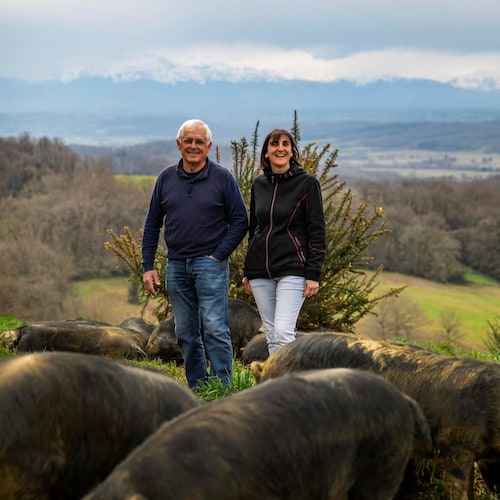 Les équipes de La Grande Epicerie de Paris sont parties à la rencontre d’Emilie et Vincent, éleveurs de Porcs Noirs de Bigorre. La race des porcs gascons remonte à l’Antiquité. Après la Seconde Guerre mondiale, elle a été menacée d’extinction due à des conditions d’élevage trop contraignantes, mais certains passionnés ont permis à la race de renaître alors qu’il ne restait qu’une trentaine de truies et quelques mâles seulement. Ces porcs aux propriétés uniques vivent en plein cœur des Pyrénées centrales, dans un paysage paisible et verdoyant. Depuis plusieurs années, La Grande Epicerie de Paris est fière d’accompagner la filière du Noir de Bigorre dans le cadre de la Sélection Engagée, qui a pour objectif de promouvoir les producteurs français, respectant la saisonnalité et le travail d’agriculteurs bien identifiés. Découvrons-en un peu plus aux côtés d’Emilie et Vincent, éleveurs de Porcs Noirs de Bigorre, et Nicolas, représentant du collectif Padouen, consortium du Noir de Bigorre.