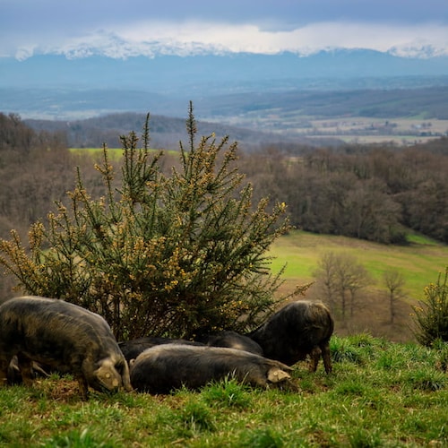 Emilie : une belle vie, face aux Pyrénées ! Nos porcs vivent en totale liberté dans les prairies, mangent des céréales de qualité et de l’herbe fraîche, et passent beaucoup de temps à gambader, ou à faire la sieste.
