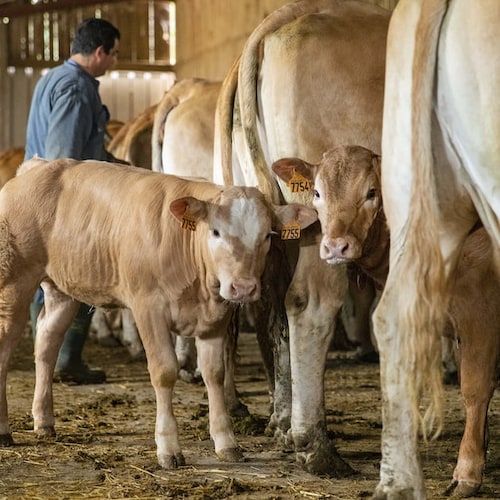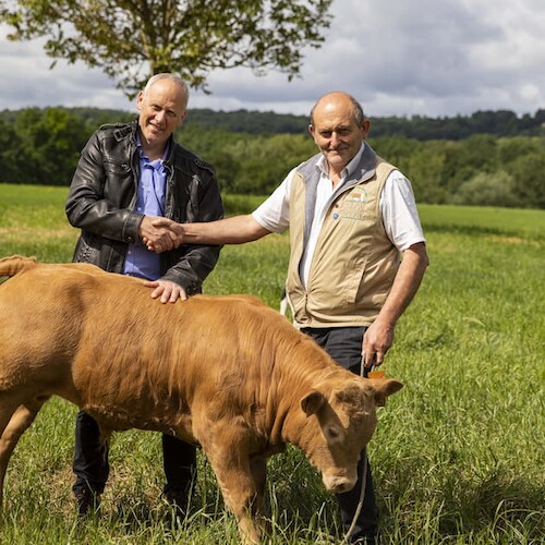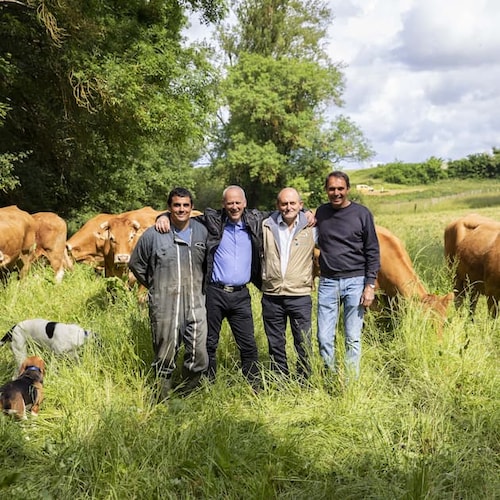 Antoine Delrue : Je me suis installé avec mon père en 2007 ; il travaillait déjà au sein de l’exploitation depuis 1975. Mon projet d’installation était l’agrandissement des bâtiments, pour pouvoir développer notre exploitation. Nous avons commencé avec une vingtaine de vaches à nos débuts, pour parvenir à plus d’une soixantaine aujourd’hui, de limousines majoritairement mais aussi de bazadaises, une race très rare. Nous avons choisi l’élevage de veaux sous la mère car c’est un modèle local, ancré dans les traditions de la Dordogne et de la Corrèze. Les sols argilo-calcaires de la région sont favorables à ce type d’élevage car ils sont naturellement pauvres en fer, permettant ainsi la production d’un veau de couleur blanche. Notre élevage est particulièrement attentif à quatre piliers : l’alimentation, la prévention, qui passe par le soin, la génétique et le savoir-faire.