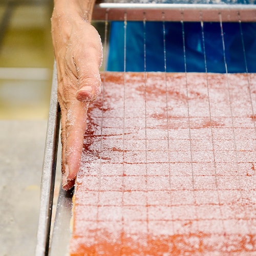 Après la cuisson, les pâtes de fruits sont soumises à un processus de séchage pendant 24 heures. Cela permet d'obtenir la texture désirée. Ensuite, les pâtes de fruits sont roulées dans du sucre pour créer une délicate croûte extérieure. La découpe est réalisée à la guitare, assurant une découpe nette et précise.