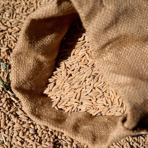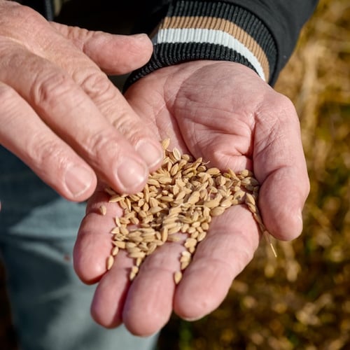 Puis, à la fin de l'été, le mistral, en véritable allié, sèche les épis, évitant moisissures et champignons. La récolte débute mi-septembre, lorsque le grain a atteint sa maturité. Une fois récolté, le riz arrive dans nos silos, encore vêtu de sa balle. Sa première enveloppe est retirée par un système de meulage, puis nous laissons le grain reposer un mois pour qu'il sèche naturellement avant de le décortiquer.
