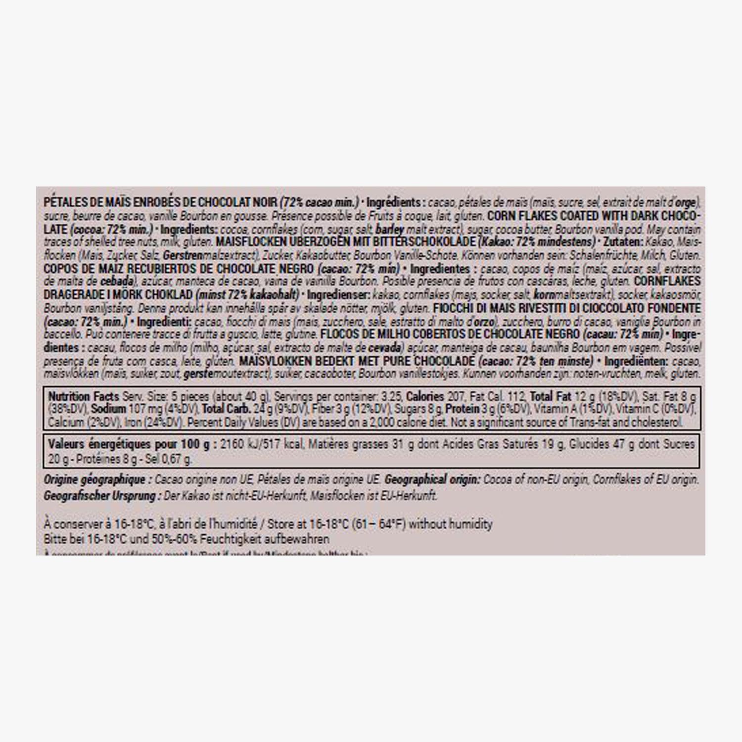 Pétales de maïs enrobés de chocolat noir (72% cacao min)