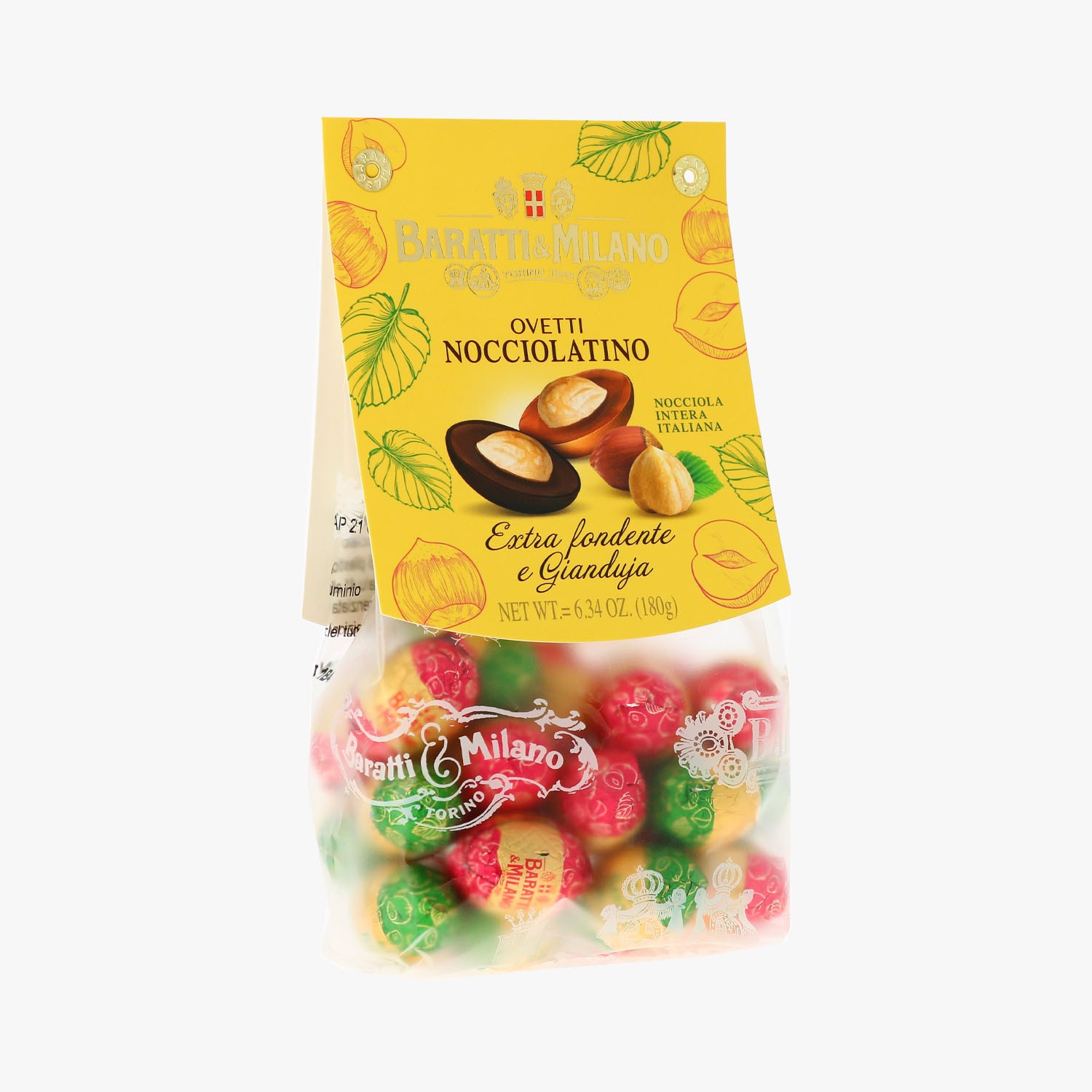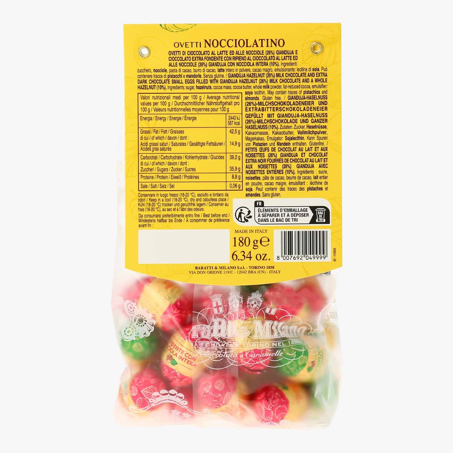 Petits œufs de chocolat au lait et aux noisettes (26%) gianduja et chocolat extra noir fourrés de chocolat au lait et aux noisettes (26%) gianduja avec noisettes entières (10%)