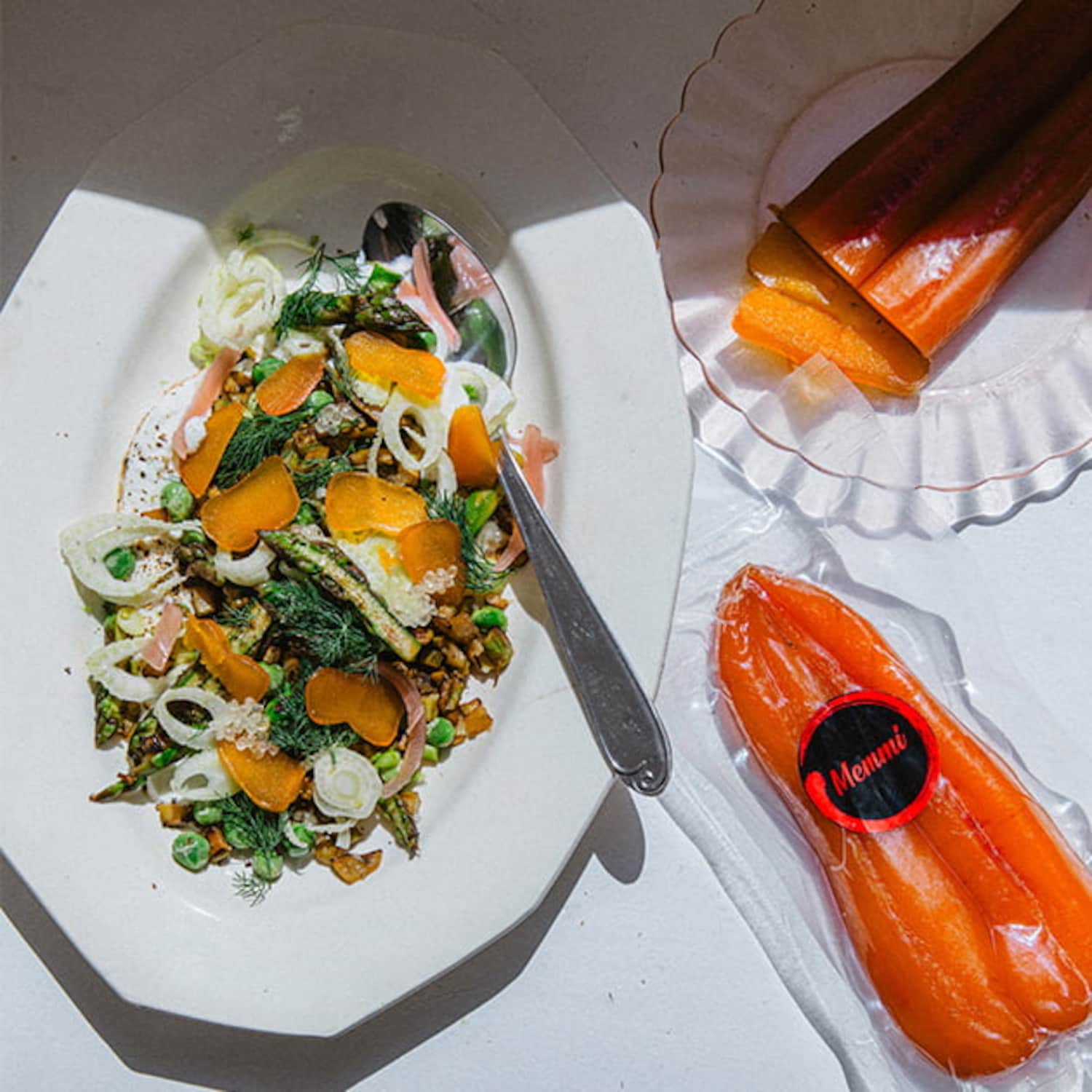 Une boutargue MEMMI|Une dizaine d'asperges vertes|2 belles poignées de petits pois dans leurs cosses|Un fenouil|Un pot de yaourt grec|Des pickles d'oignon rouge|Un citron caviar|Un demi citron confit|Une branche d'aneth|Huile d'olive|Sel et poivre