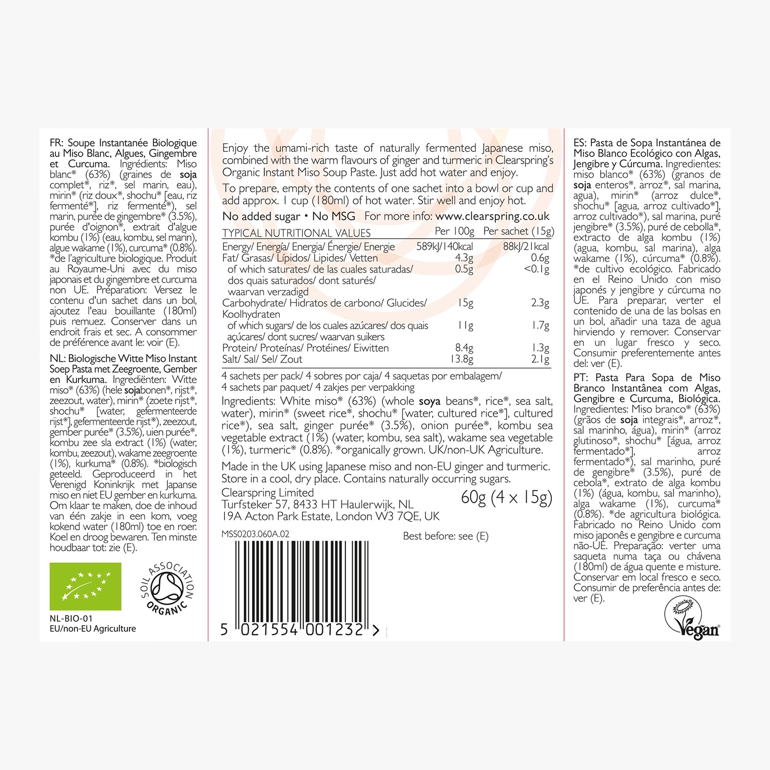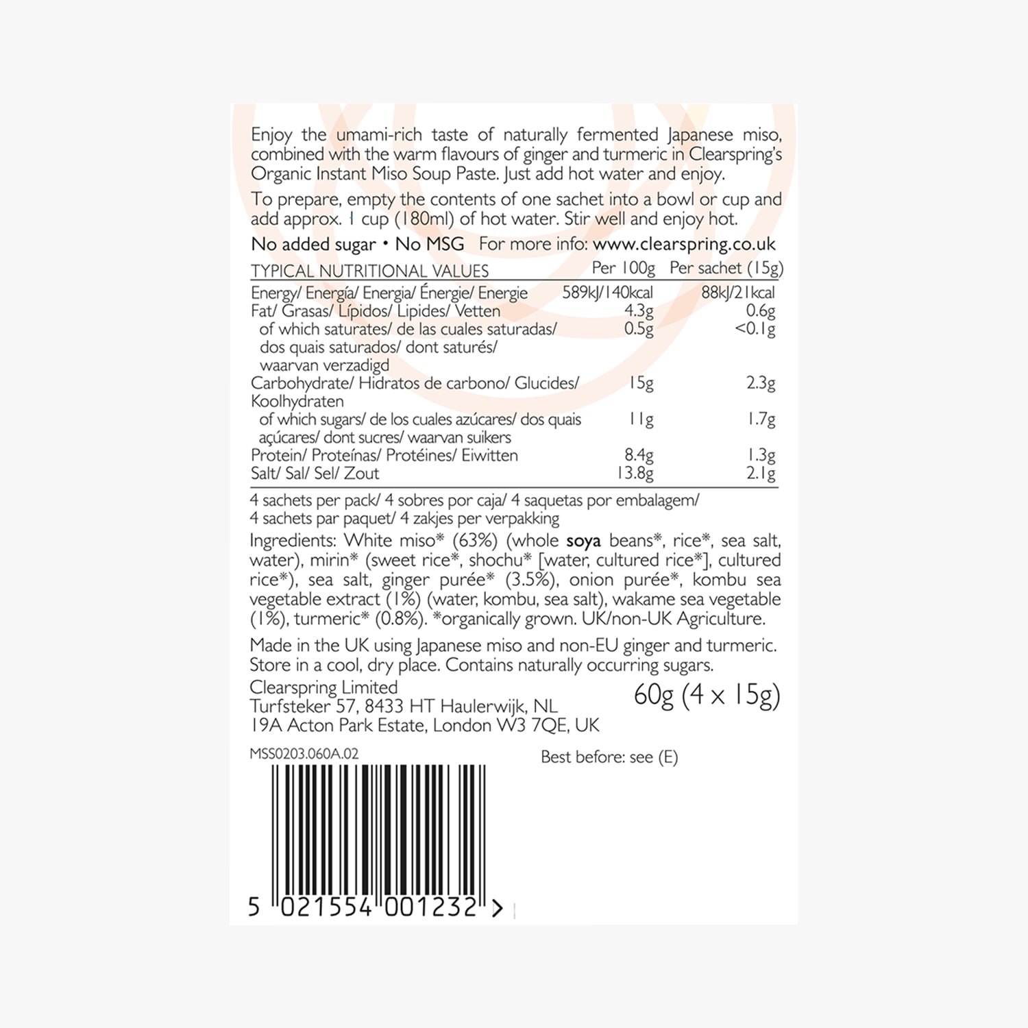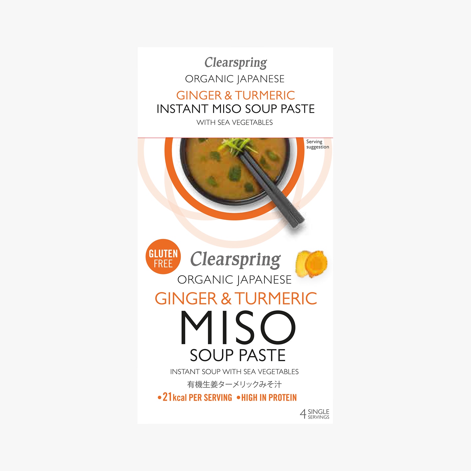 Soupe instantanée biologique au miso blanc, algues, gingembre et curcuma Clearspring