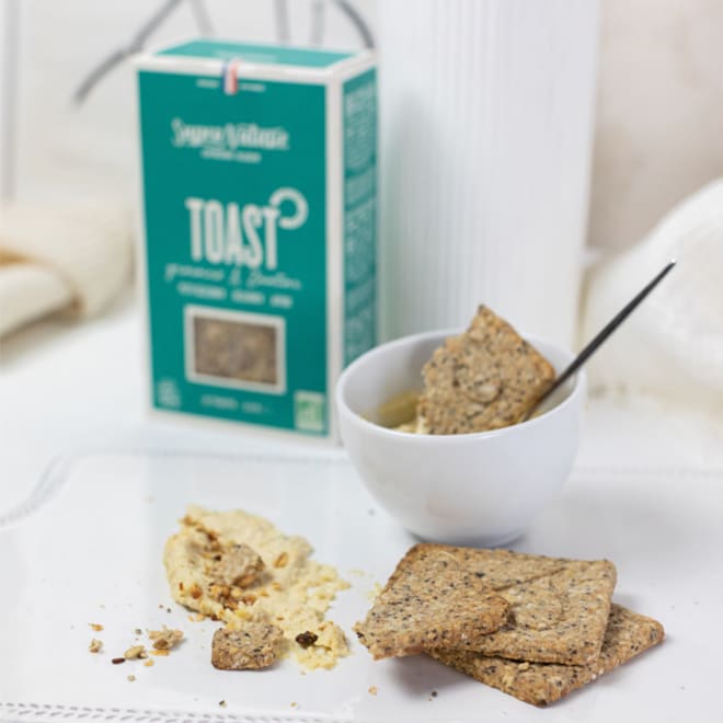 Ces Toasts nomades à tartiner & à dipper fabriqués en France à partir d'ingrédients bruts, certifiés BIO ont des propriétés nutritionnelles uniques (riches en Oméga 3, riches en fibres, faibles en sucre).