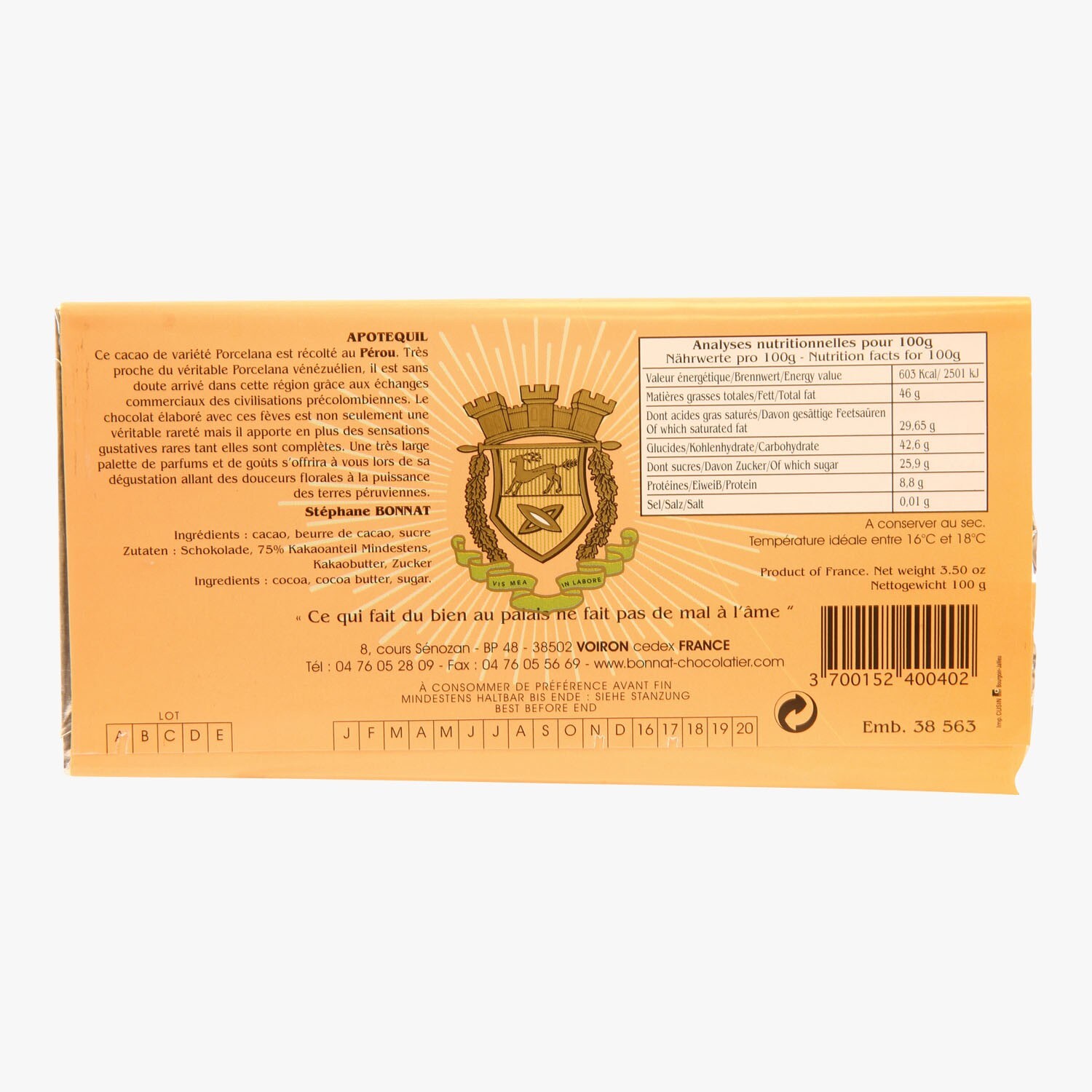 Ce chocolat est un véritable grand cru d'exception. À base de fèves de cacao rigoureusement sélectionnées, par le chocolatier-confiseur Stéphane Bonnat, ce chocolat procurera un moment de plaisir et de dégustation. Il se dévoile sous des notes riches, parfumées et une pointe légèrement acidulée...