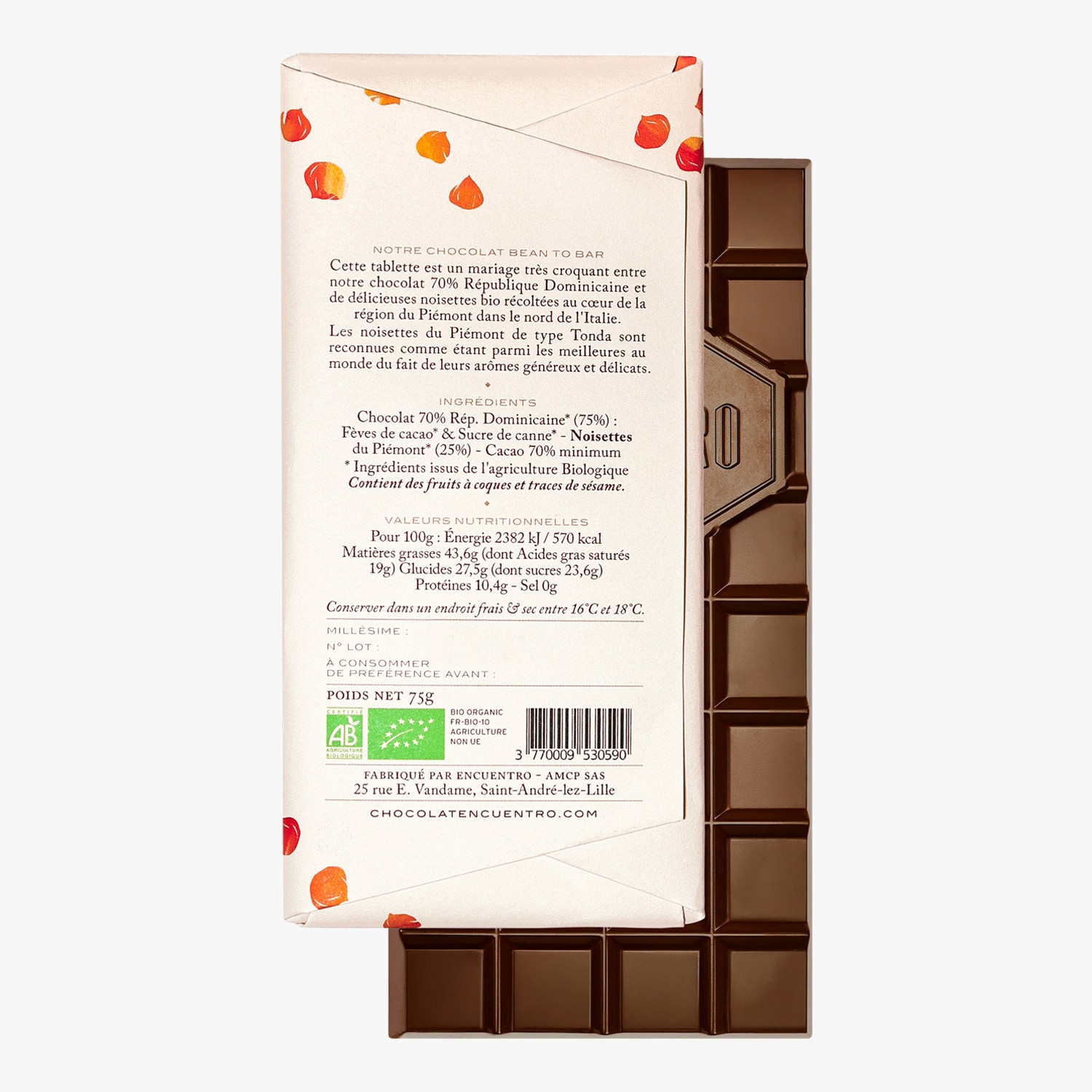 Tablette chocolat 70 % aux noisettes du Piémont