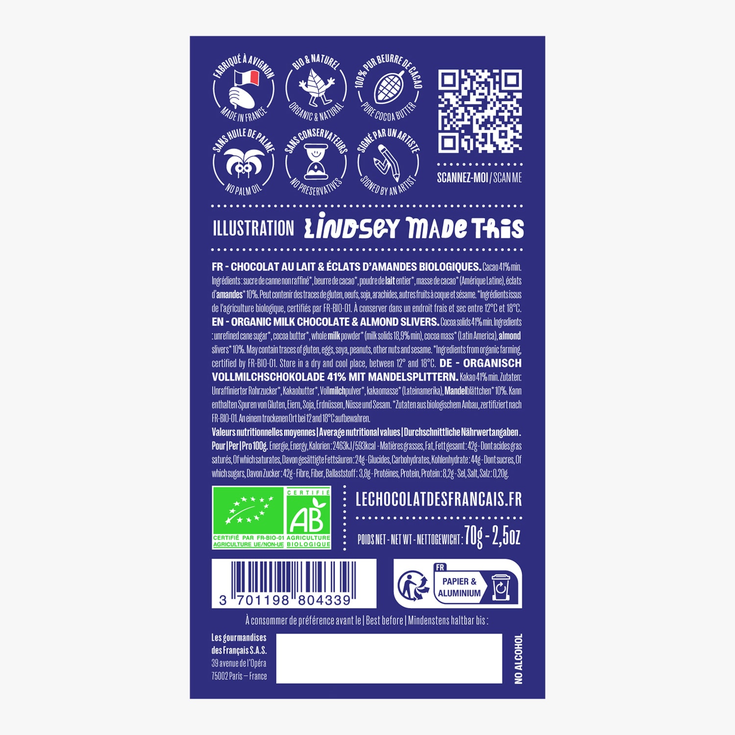 Chocolat au lait 41 % cacao min et éclats d'amandes