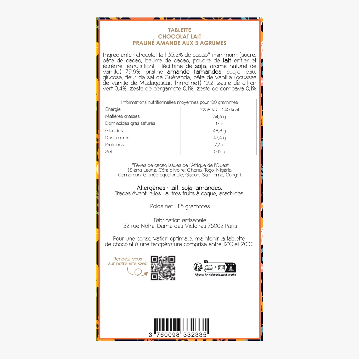 Tablette chocolat lait 35,2% de cacao praliné amande aux 3 agrumes