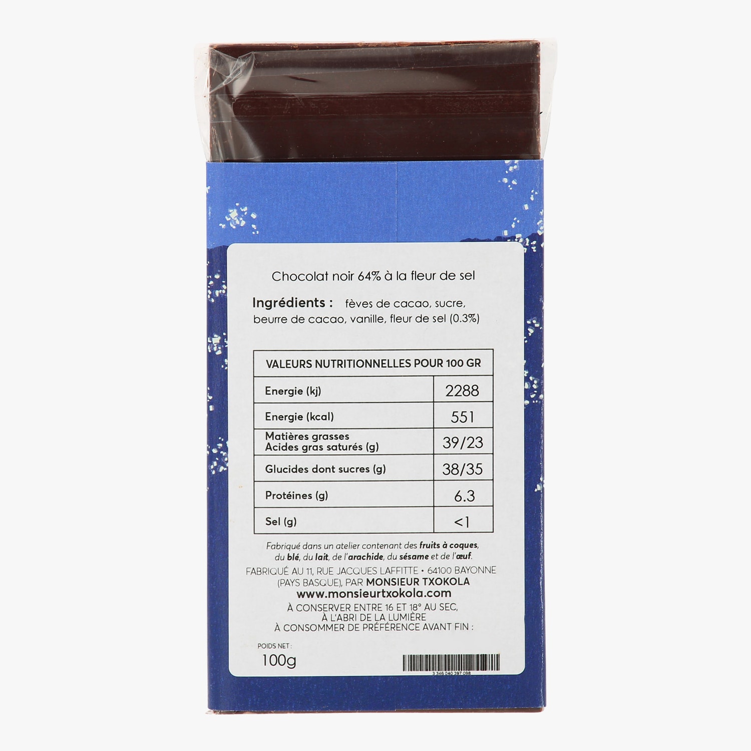 Tablette chocolat noir 64 % à la fleur de sel du Sud-Ouest