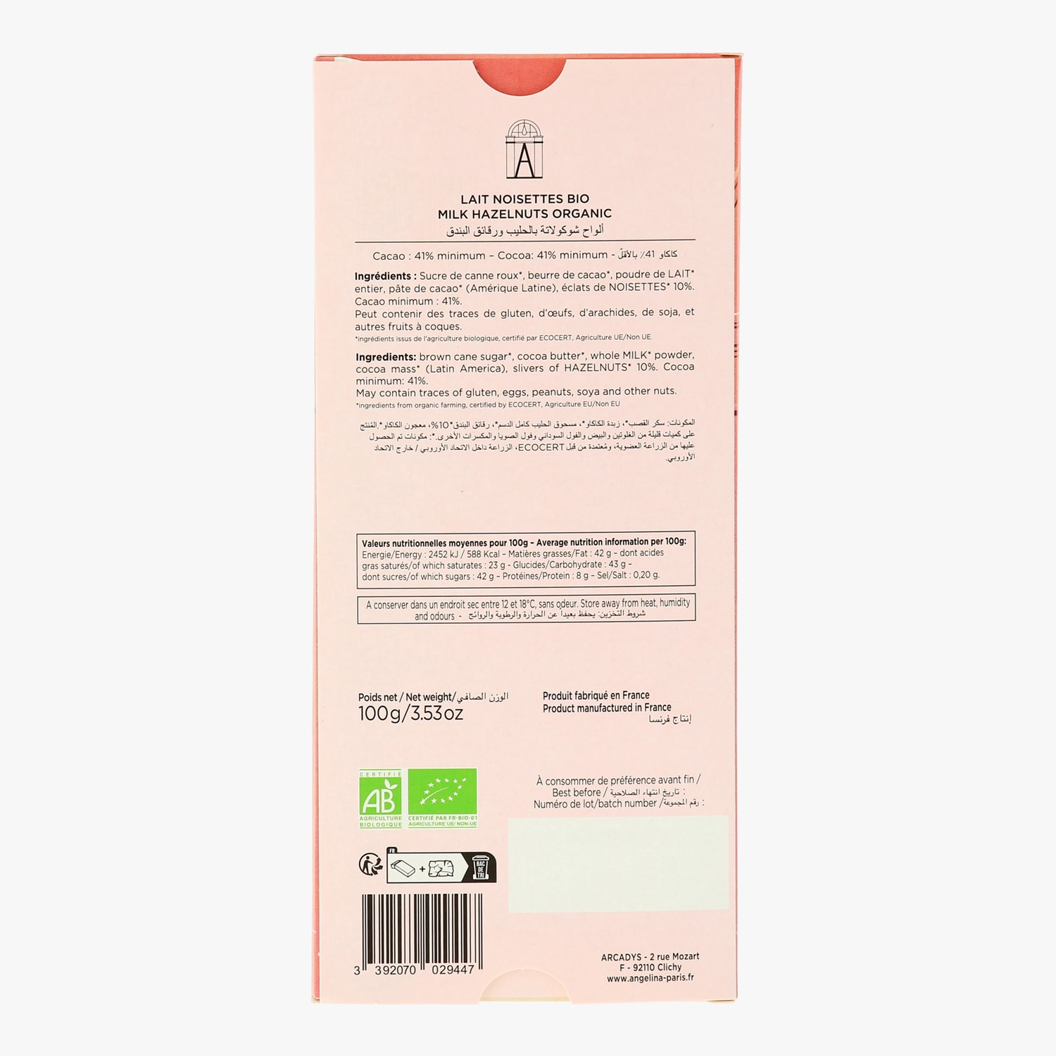 Tablette de chocolat au lait et aux noisettes bio Angelina