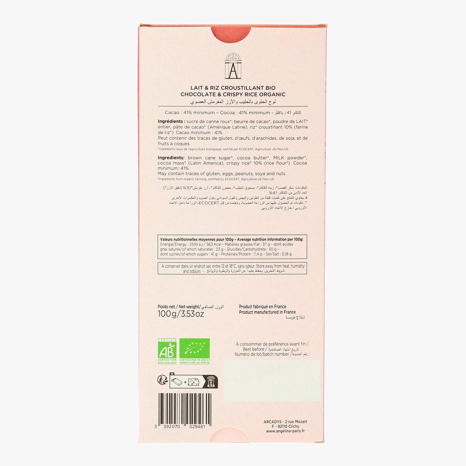 Tablette de chocolat au lait et riz croustillant bio Angelina