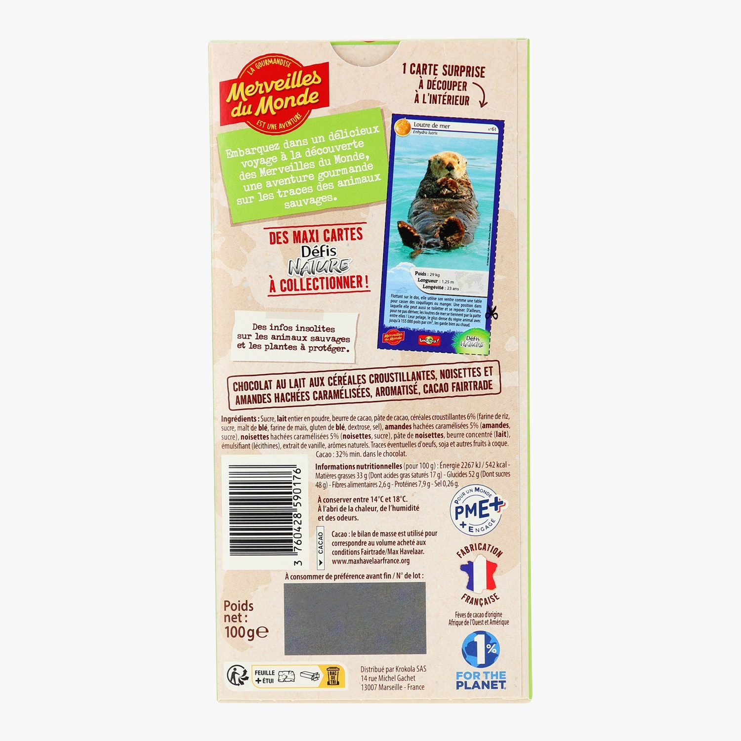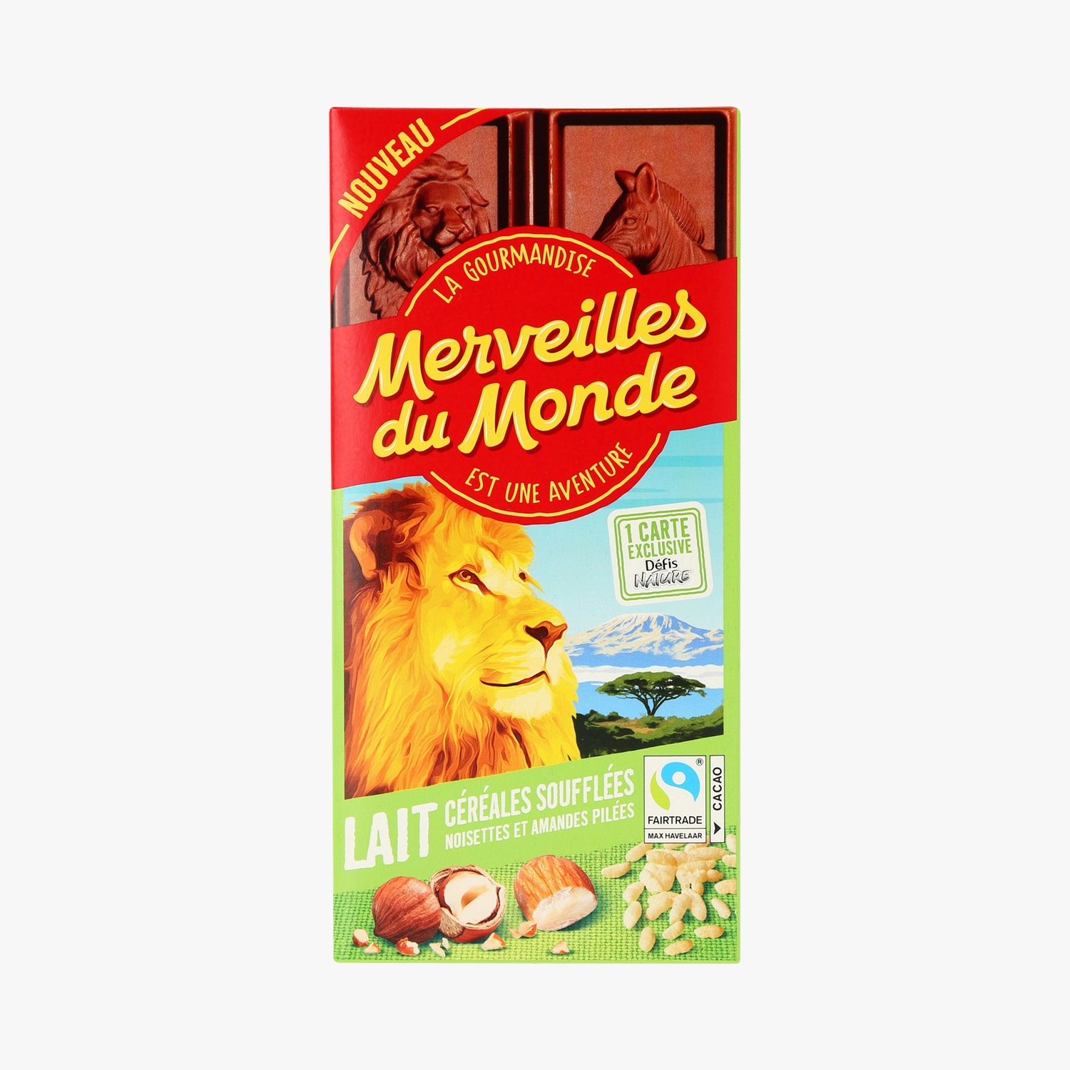 Tablette de chocolat lait céréales soufflées noisettes et amandes pilées