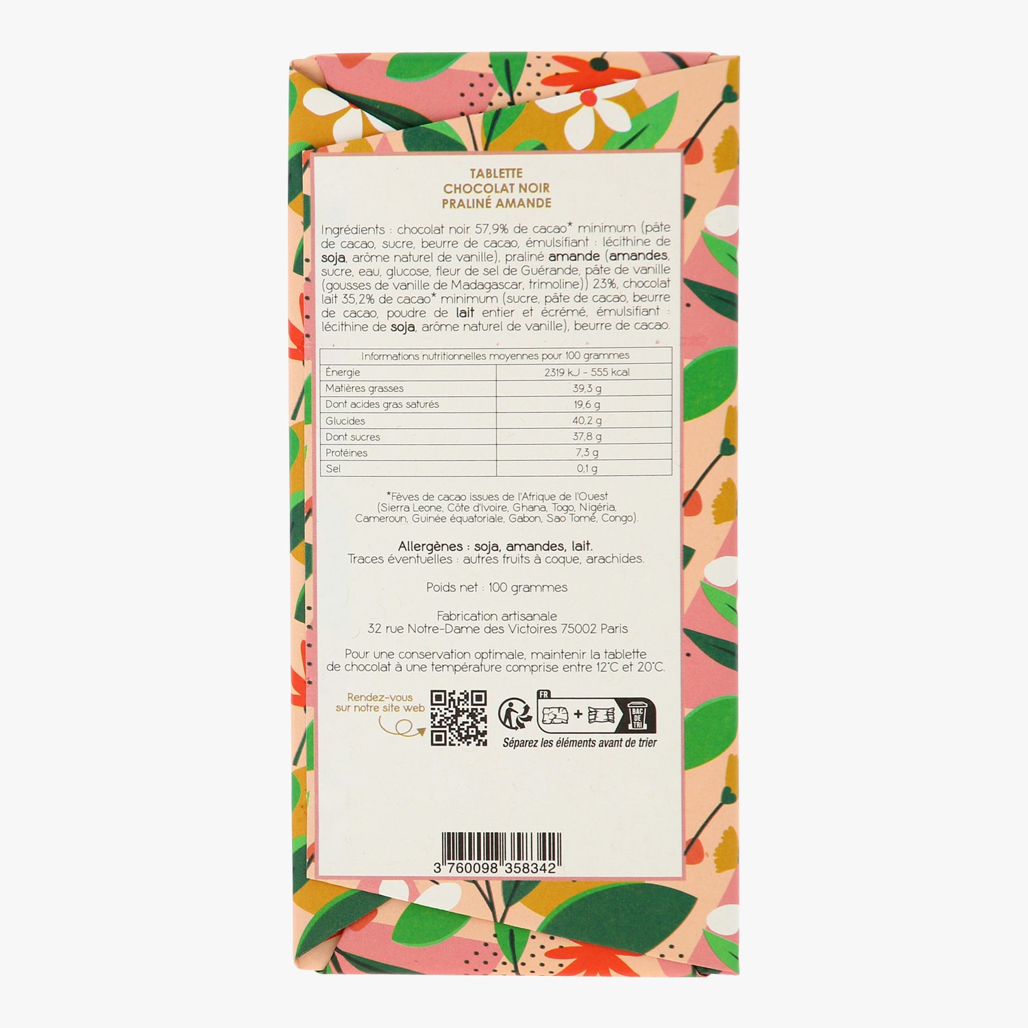 Tablette chocolat noir 57,9 % de cacao minimum praliné amande