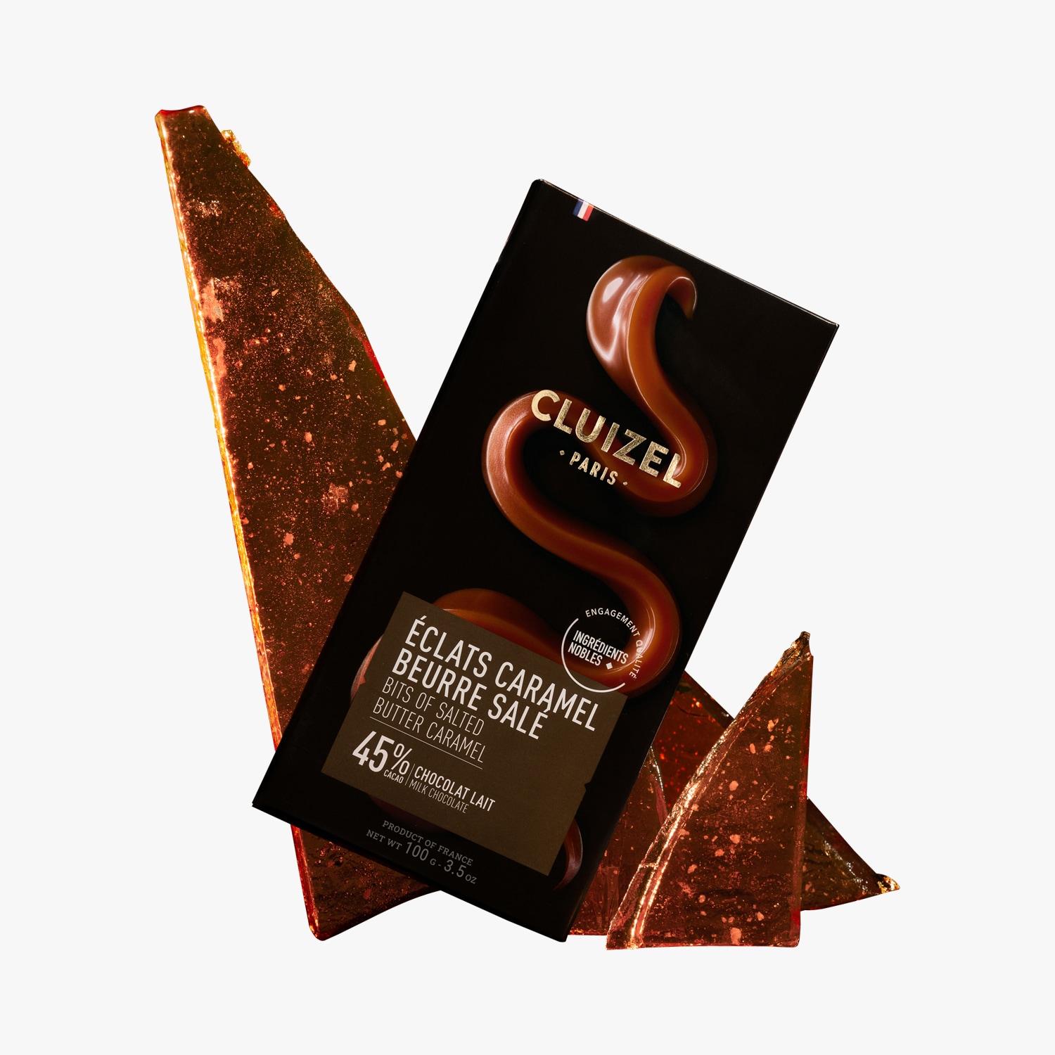 Chocolat au lait 45% de cacao minimum éclats de caramel (18% min.) et beurre salé (0,02% min.)