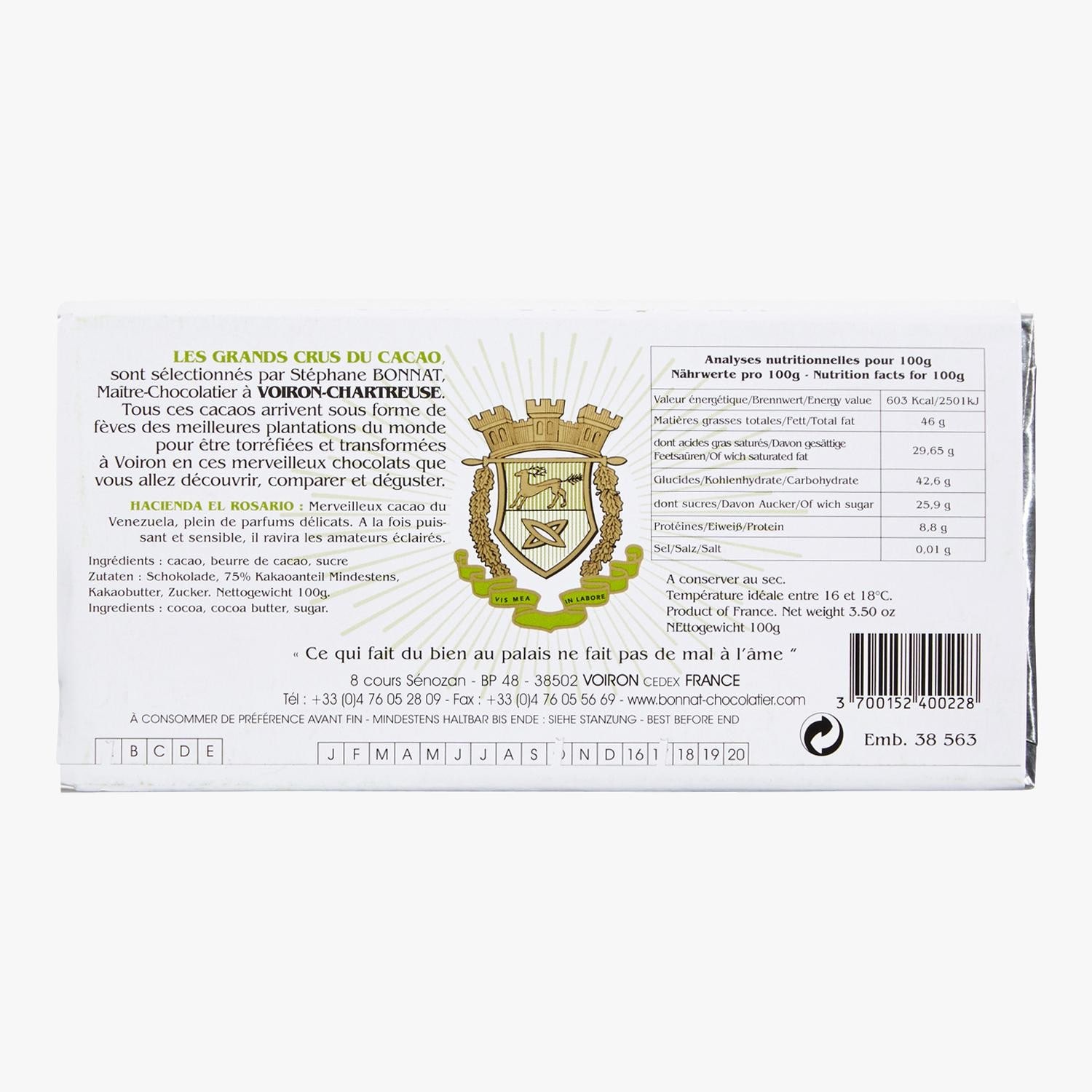 Tablette Hacienda El Rosario Chocolat noir 75 % de cacao Bonnat