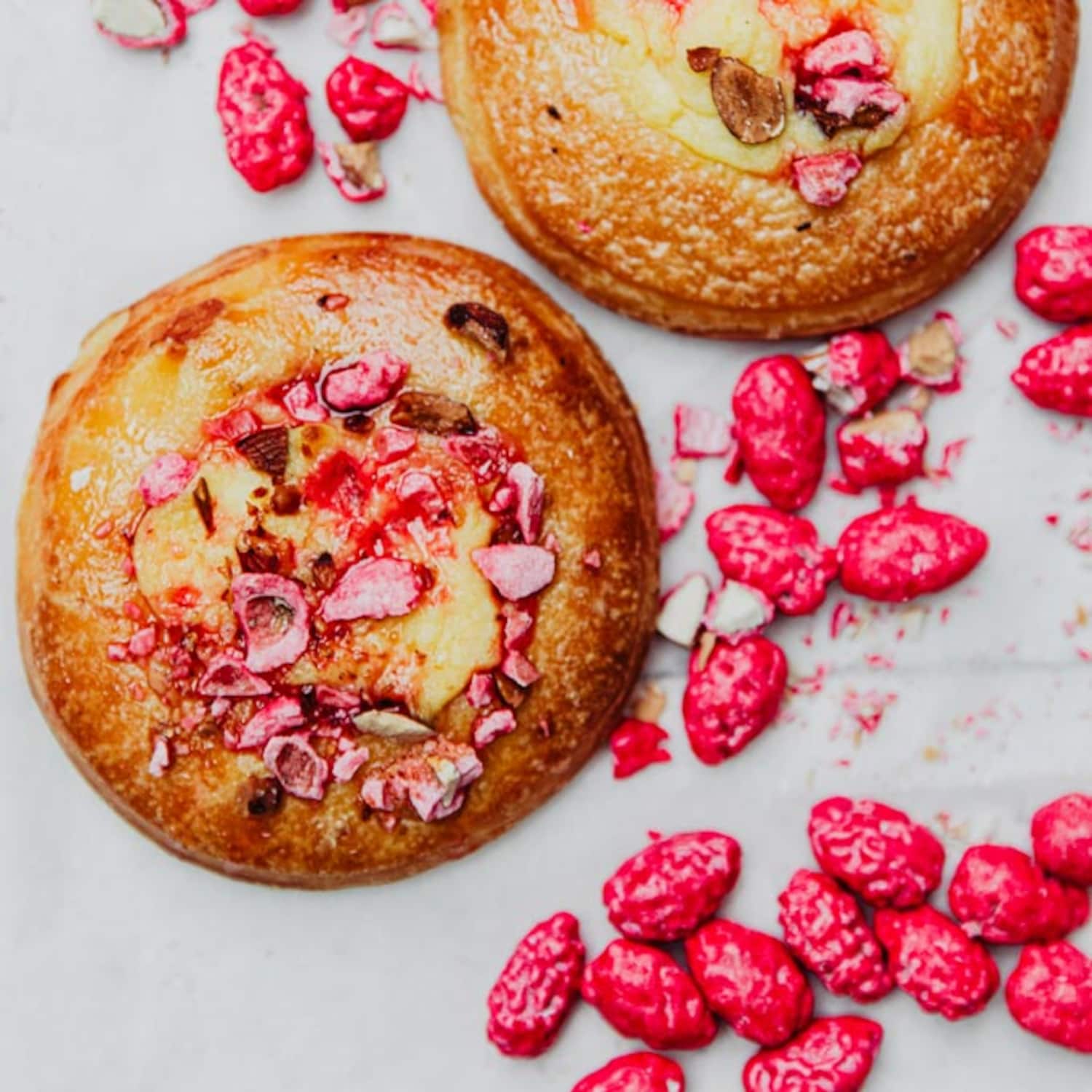 12A l’aide d’une poche à douille, dressez une pointe de crème pâtissière* et saupoudrez de pralines concassées.