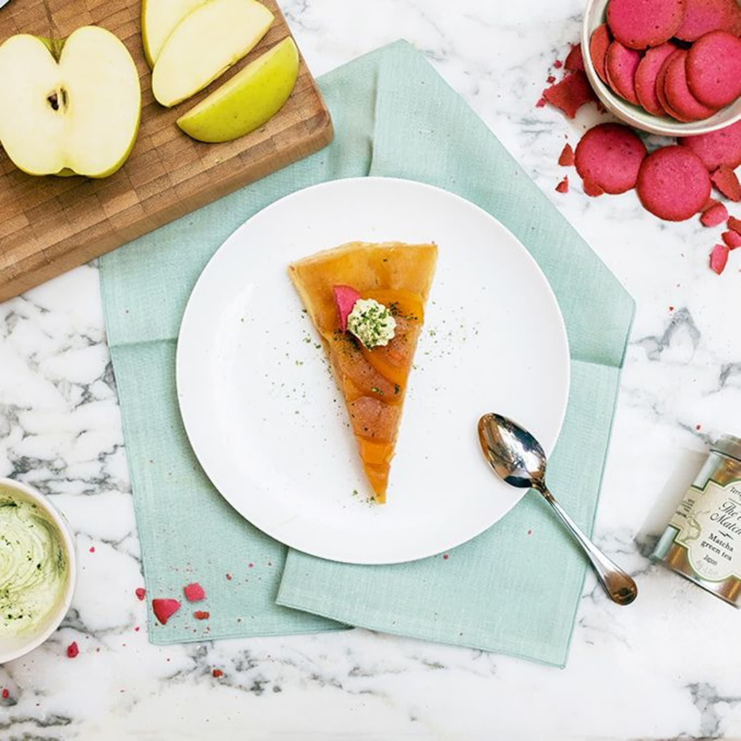 Tarte tatin aux pommes et écorces de pamplemousse confites. Chantilly au thé matcha
