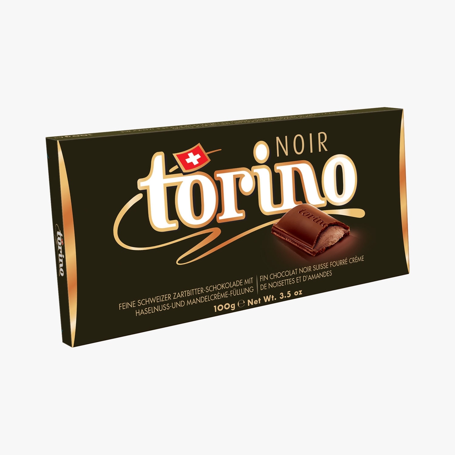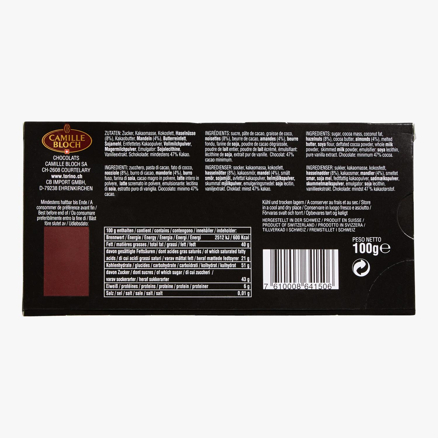 Un chocolat noir fourré à la crème d'amande et de noisette.