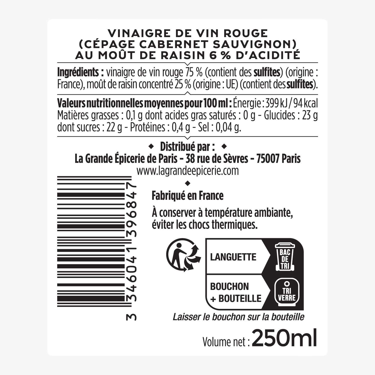 Vinaigre de vin rouge (cépage Cabernet Sauvignon) au moût de raisin 6% d’acidité La Grande Épicerie de Paris